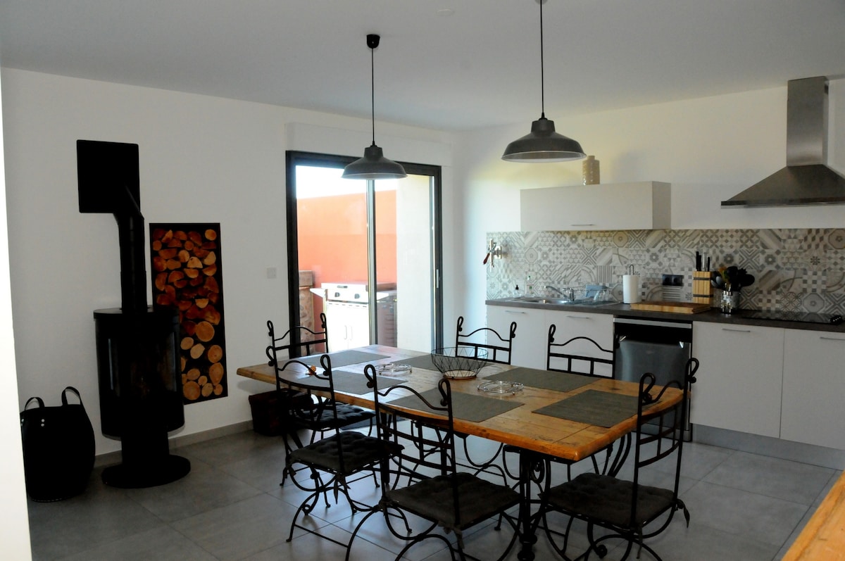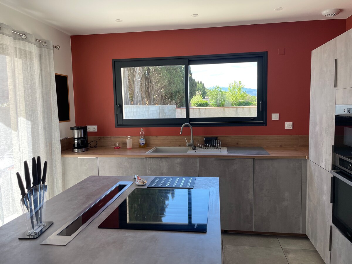 Bienvenido a nuestro remanso de paz, antigua bodega, completamente renovada, de más de 170 m². Este alojamiento moderno y luminoso se encuentra entre el mar y las montañas con unas impresionantes vistas panorámicas de la montaña desde la terraza. A 15 minutos de la frontera española, situado en un pequeño pueblo. Pequeñas tiendas a unos 3 km de los alrededores y supermercado a 5 minutos en coche. Un aparcamiento público está disponible al lado del granero.