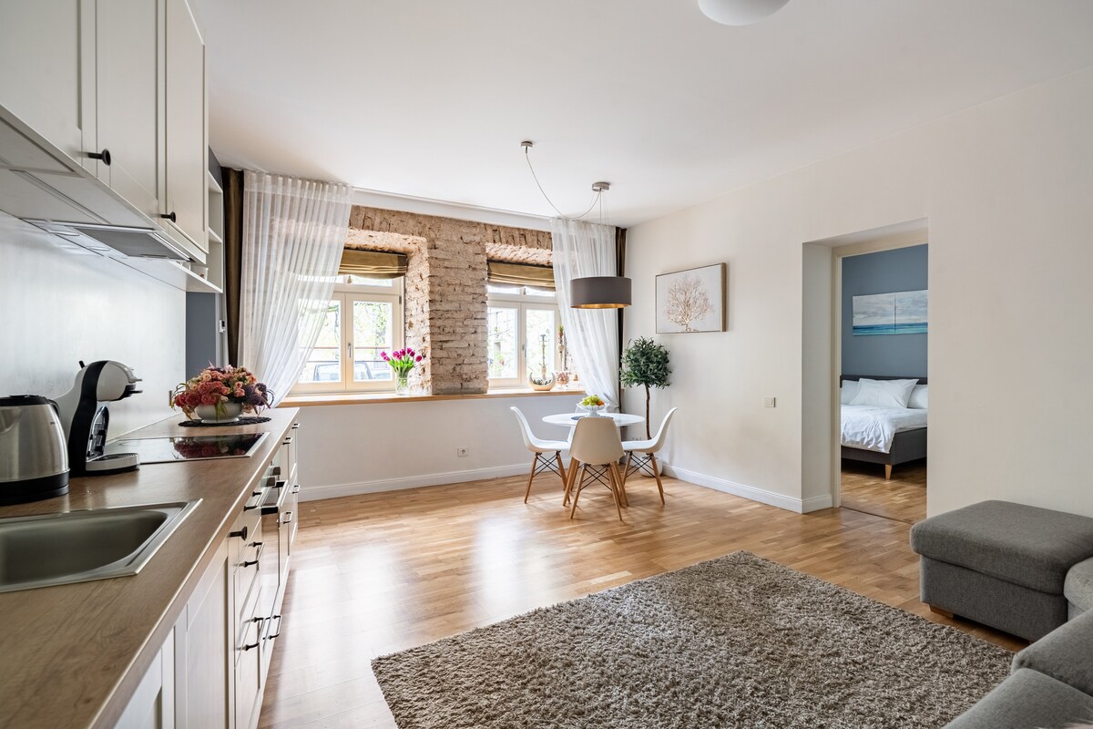 En estos apartamentos únicos de 48 metros cuadrados encontrará dos camas tamaño king, internet, aire acondicionado, una ducha excelente, una cocina totalmente equipada y 4 lugares de trabajo (2 mesas + 2 alféizares). En el corazón del casco antiguo de Vilna, tendrá la oportunidad de sentir el verdadero aliento histórico del pasado tocando las vigas de madera de 500 años de antigüedad, los ladrillos de mampostería gótica, el yeso y los artefactos. ¡En un radio de 300 m encontrará 33 restaurantes, 2 supermercados, 5 museos y 12 iglesias! No se arrepentirá, ¡es un lugar realmente mágico!