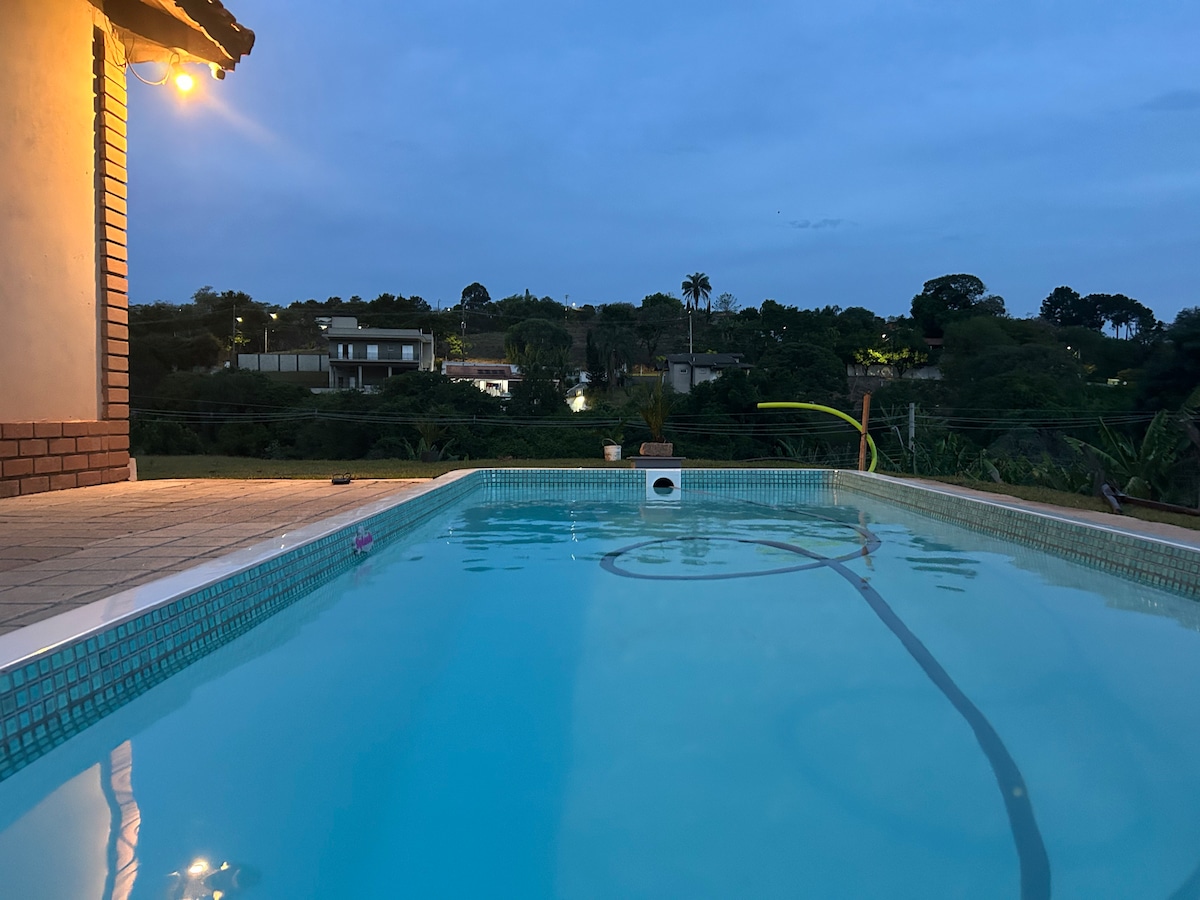 Granja de 6.000 m2, camas para 15 personas, calle asfaltada cerca del Country Club de Valinhos, entre Valinhos y Vinhedo. 3 dormitorios con TV y ventilador de techo, 3 baños, garaje con 8 plazas, CARGADOR VEHICULAR WEG, ocio completo con piscina de 20 metros, CALEFACCIÓN SOLAR y cascada, SPA Jacuzzi junto a la piscina, huerta con muchos árboles frutales, palmeras imperiales, flores y animales silvestres que frecuentan el lugar como titíes, gavilanes, rollos, sabiás, etc.