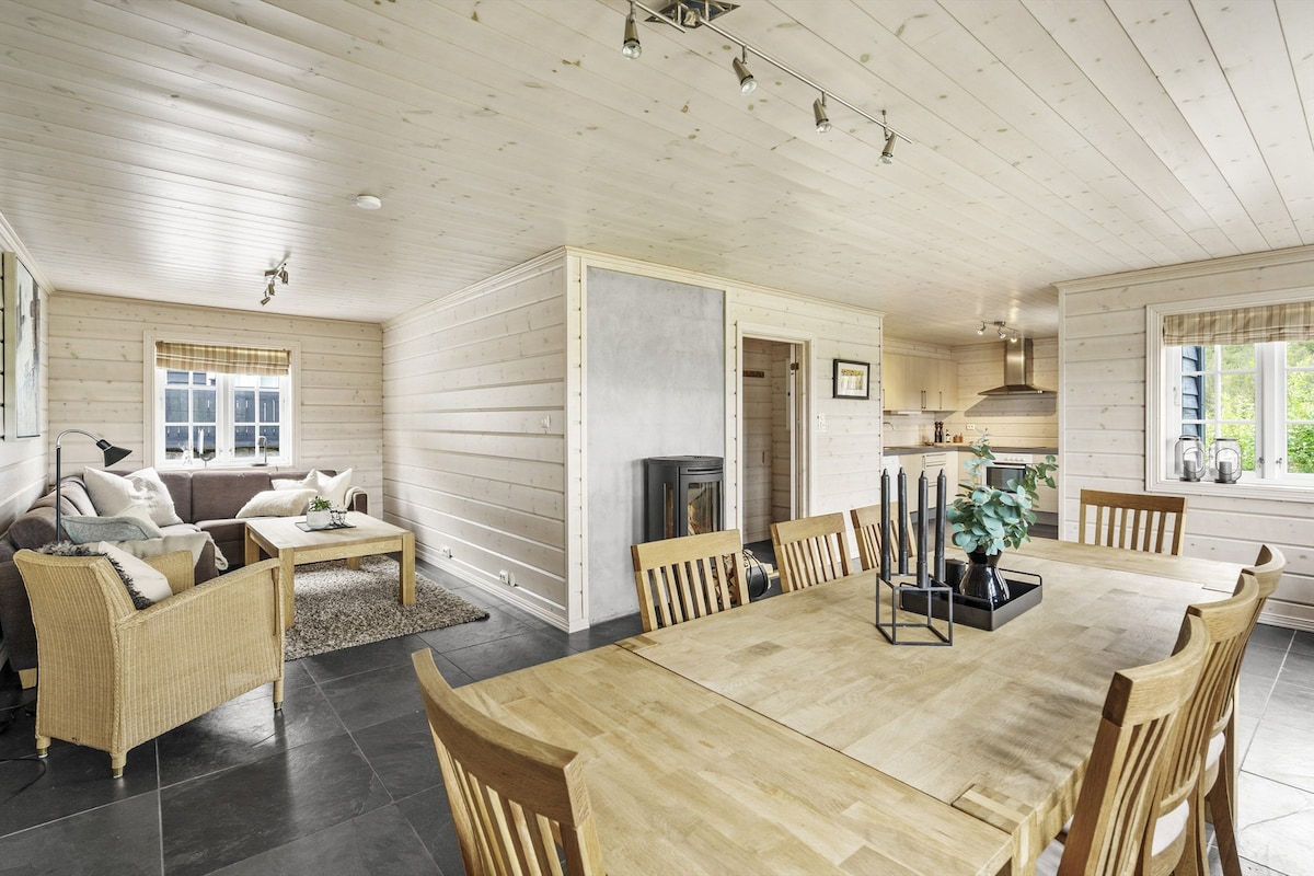 Realmente no notas el ruido hasta que se calma. Aquí es bueno estar, tanto para jóvenes como para mayores. Perfecto para un fin de semana de novio con aire fresco, chimenea, altas montañas y mañanas tranquilas. O una relajante escapada familiar con juegos de mesa y pequeñas caminatas. Adecuado para desintoxicación digital, yoga en la terraza y senderismo en la hermosa naturaleza de montaña. ¿Tal vez incluso un baño? Se tarda unos 15 minutos en llegar en auto a Fjellstrand con playa de arena fresca en Austbø. Aquí puedes caminar tanto corto como lejos en un terreno encantador.