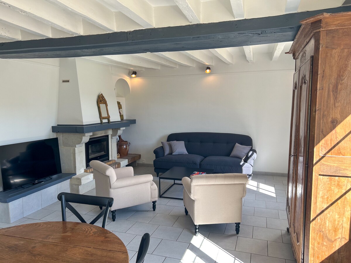 «La Blandinière» Casa con encanto, totalmente renovada, 45 m2 En un entorno verde y tranquilo. A dos pasos del Loira. Arriba hay un dormitorio con una cama grande, cuarto de baño, aseo. En la planta baja, una habitación con el encanto de las casas antiguas que incluye una zona de cocina, sala de estar con sofá, mesa, TV, wifi. Barbacoa, muebles de jardín, tumbonas, bicicletas. Cerca: golf, senderismo y equitación , visitas a bodegas, piragüismo, mercados , pesca, ciclismo de montaña, museos, castillos.