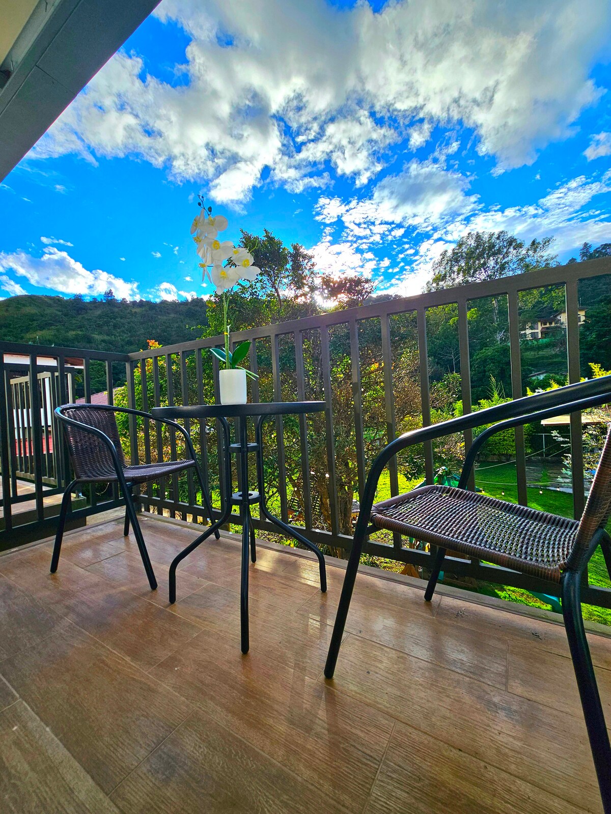 Luxurious one bedroom apartment with incredible view from above to town at CASA EJECUTIVA BOQUETE. A full kitchen, 1.5 bathrooms, 2 king sized beds, 1 queen bed and section to entertain guests. It has a full wrap around balcony and is extremely secure, with the only entrance being a single heavy oak door. Fast primary internet connection (~100mbps), backup internet connection, solar panels, and water tanks on site. We never lose water or power. No stairs for this apartment.