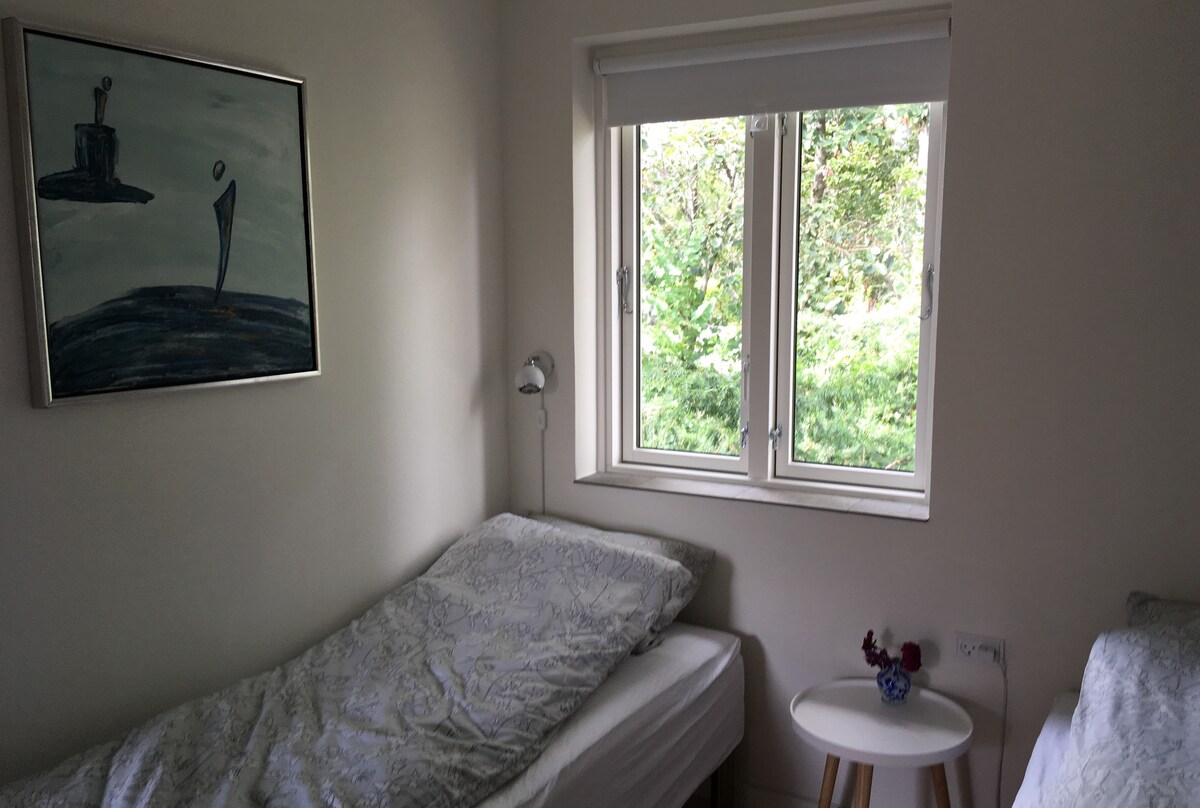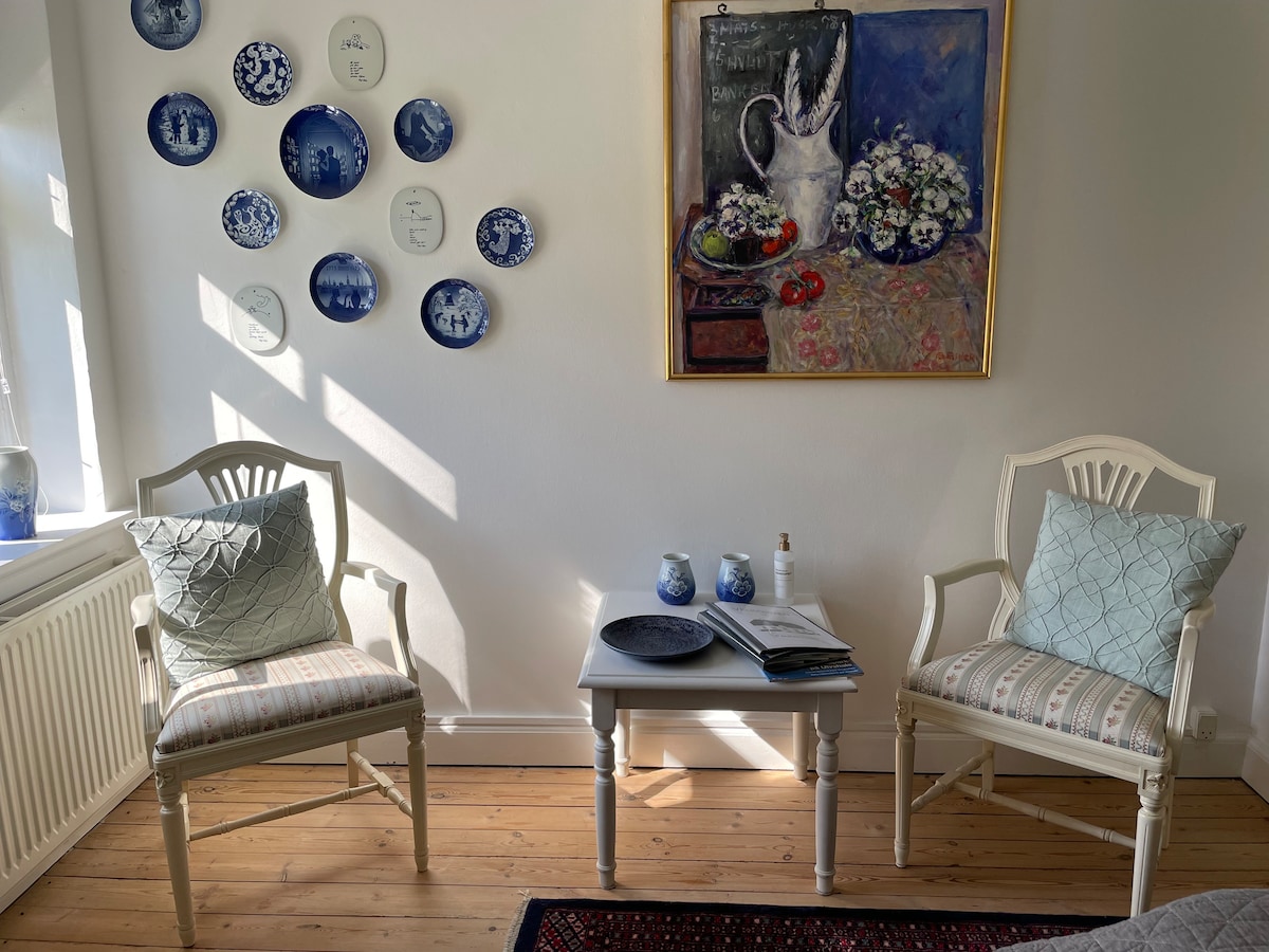 Su habitación está situada en la casa principal de una propiedad de 1923. La habitación ha sido recientemente renovada y está orientada al oeste, con vistas a la puesta de sol sobre la bahía de Stege y el puente de la Reina Alejandrina. Le invitamos a utilizar el gran jardín con manzanas, peras, cerezas e higueras, donde se han colocado sillas para que pueda disfrutar de la vista y la tranquilidad con una copa de vino. Es posible reservar la cena y el desayuno que se sirve en nuestro amplio y acogedor comedor.