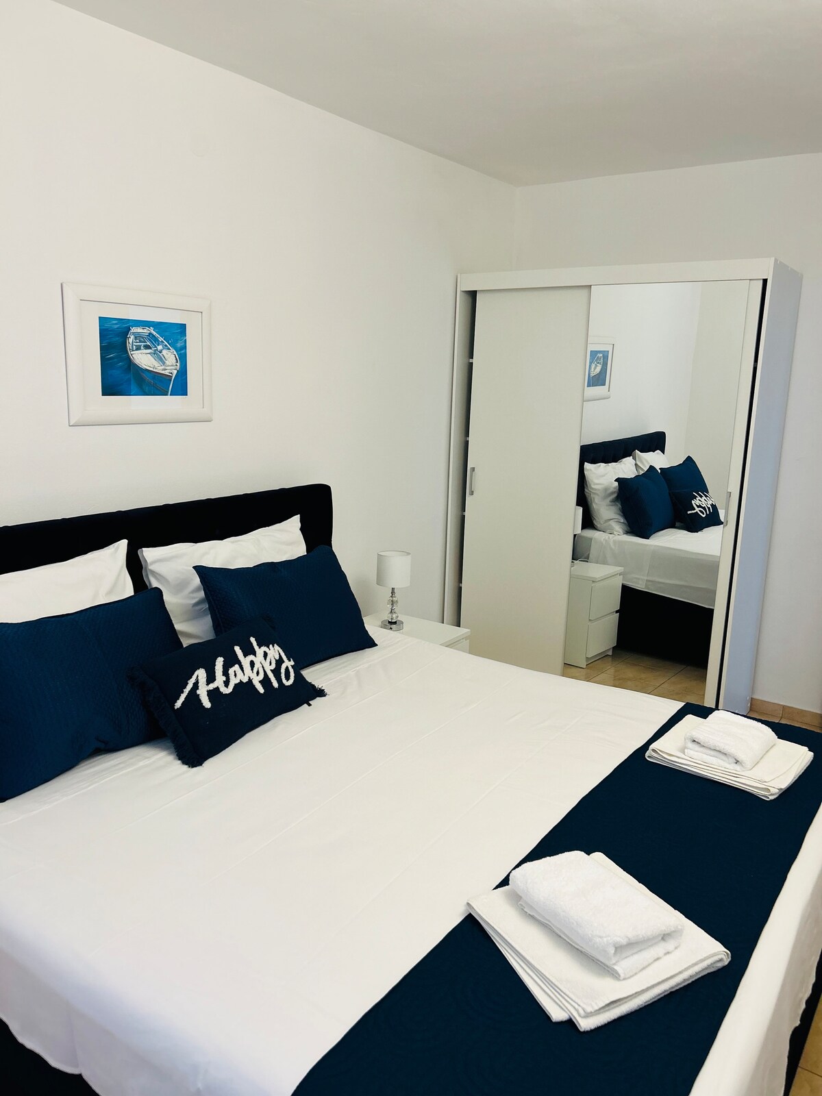 El apartamento de 60 m 2 consta de un dormitorio con una gran cama doble, un baño, una amplia sala de estar con una cocina, una antesala y un balcón. Toda la pared sur del mar está en vidrio, por lo que el espacio tiene mucha luz y con un balcón constituye un espacio. El departamento está ubicado en el tercer piso de la casa, que se encuentra cerca del centro de la ciudad (5 minutos a pie a lo largo del mar) y desde el balcón tiene una vista abierta del mar y de las islas, ya que la casa se encuentra en la primera fila junto al mar.