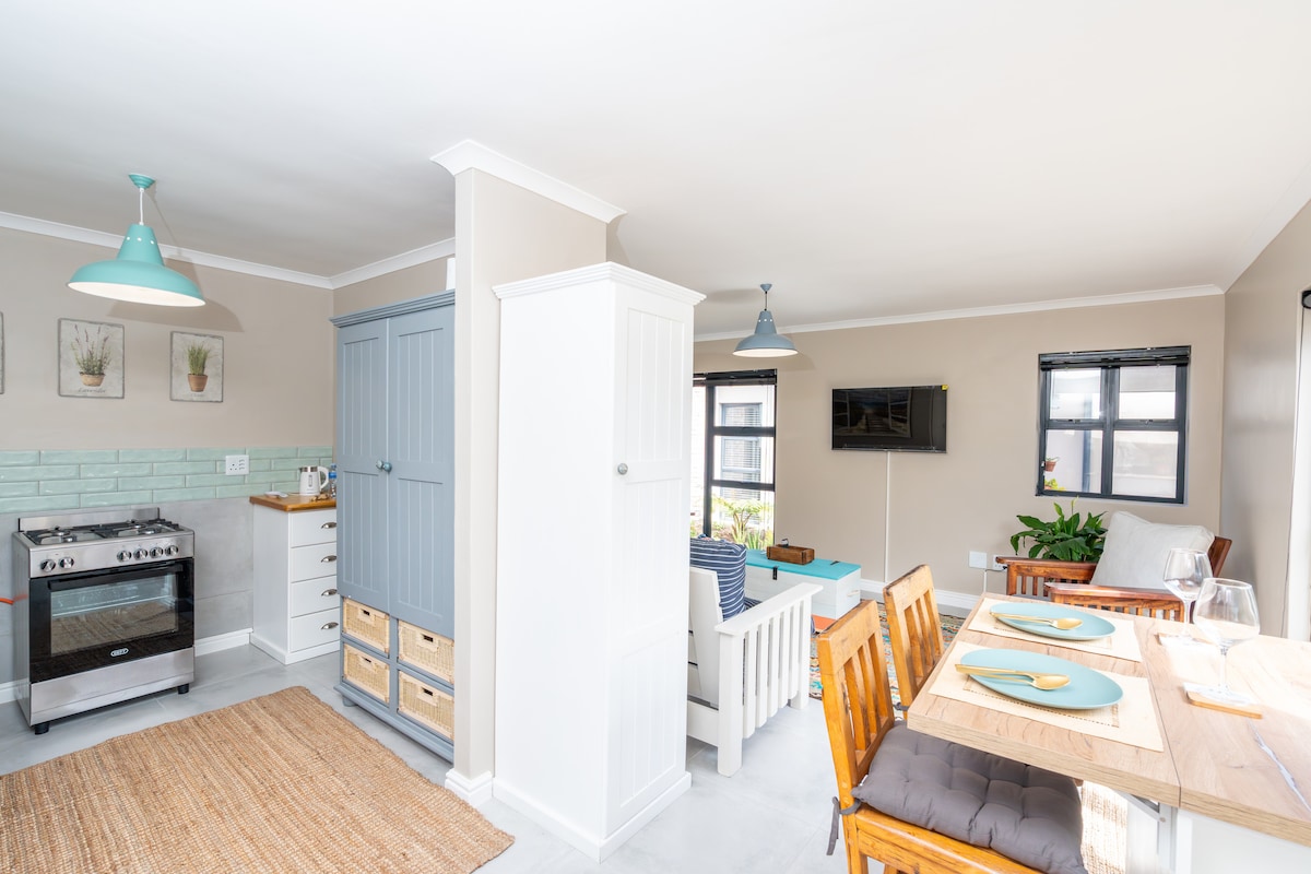 Our apartments are sanitized between every guest departure and arrival by me personally. With its white washed walls, blue finishes and seconds from the endless stretches of white sandy beaches with azure waters, mysterious sunrises, and vivid sunsets . This apartment sleeps a couple Beautiful upstairs Bachelor's unit with Limited Sea Views , queen bed, kitchenette, en-suite bathroom with shower and SHARED patio with outside braai/barbecue. Situated approximately 80m from the beach.