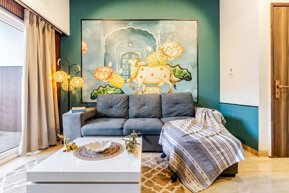 Peaceful, pretty & artsy! Less than 3 Kms (10min) from Prem Mandir, 3.5 Kms (12min) from ISKON and (15min) 4.5 Kms from Banke Bihari Step into a world of art and tranquility at our Pichwai-themed studio. This beautiful home features elegant fittings, stunning interiors, and a charming sit-out balcony perfect for relaxation. Enjoy easy access to prime temples, immersing yourself in the spiritual essence of Vrindavan. Abundance of modern amenities to ensure a comfortable and memorable stay.