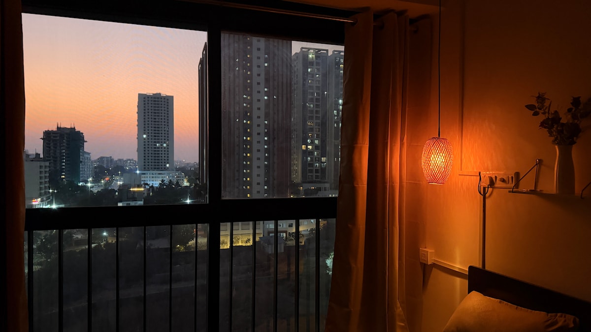 This cozy stay comes with a spacious terrace, perfect for sunset views and sky-gazing with friends. Enjoy your morning coffee or unwind at night in total peace-no disturbances, just calm vibes. Big private terrace Near the airport (super convenient!) Free covered parking on-site WiFi for work or chill (60mbps) Inverter power backup Induction&Kettle Perfect for couples, friends, family. Pet friendly Electric Vehicle charging point This space is your little slice of comfort under the open sky.