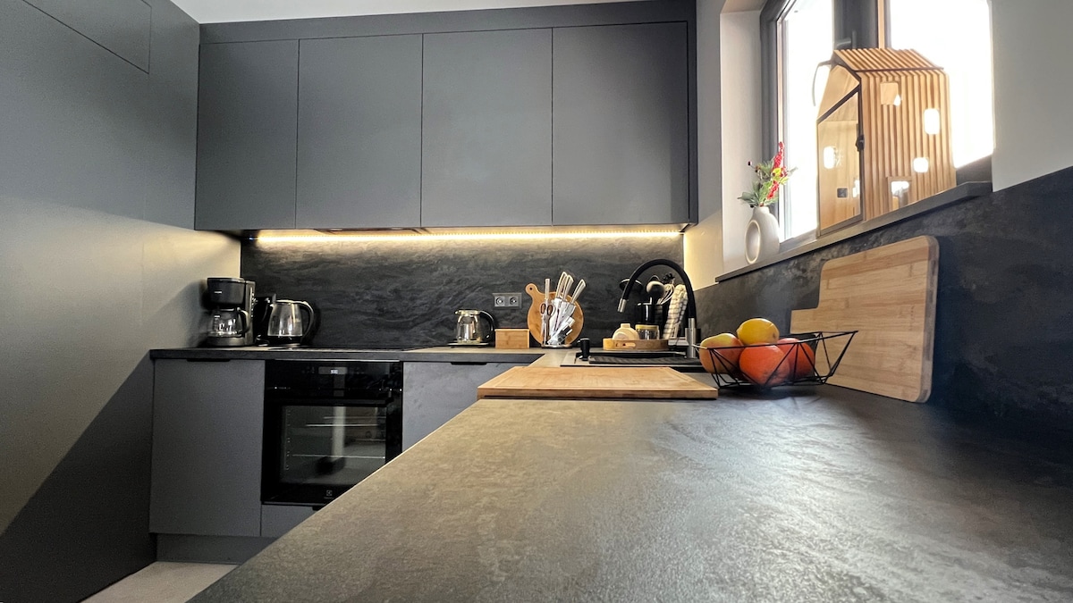 Un lugar para el trabajo creativo y la relajación. Encontrarás una cocina grande totalmente equipada con mesa de roble, Internet y una sala audiovisual con proyector láser y sonido 5.1, que, después de doblar las sillas, puede convertirse en una sala de yoga. Las habitaciones altas están diseñadas con un enfoque en los detalles, por lo que los materiales naturales, la iluminación y los colores suaves, todo por el placer de alojarse en una villa del siglo XIX. El piso de roble original y los marcos de las ventanas se han recuperado siempre que sea posible. Entrada privada. ¡Disfruta tu estadía!