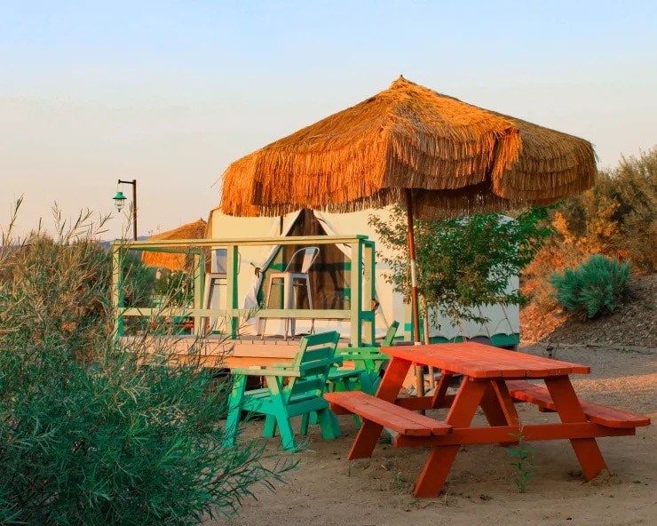 Disfruta del encantador entorno de este romántico lugar en la naturaleza. La vida junto al lago se encuentra con las vistas de la montaña de la Sierra Oriental en este elegante santuario de cabañas de tiendas de campaña. Opta por dejar tu tienda de campaña en casa para alojarte en esta cabaña de tienda de campaña amueblada de primera categoría. Completo con energía solar, un pequeño ventilador, calentador de propano, parrilla para barbacoa, sombrilla de palapa, fogata y una mesa de picnic al aire libre, disfrutarás de una experiencia de glamping excepcional.