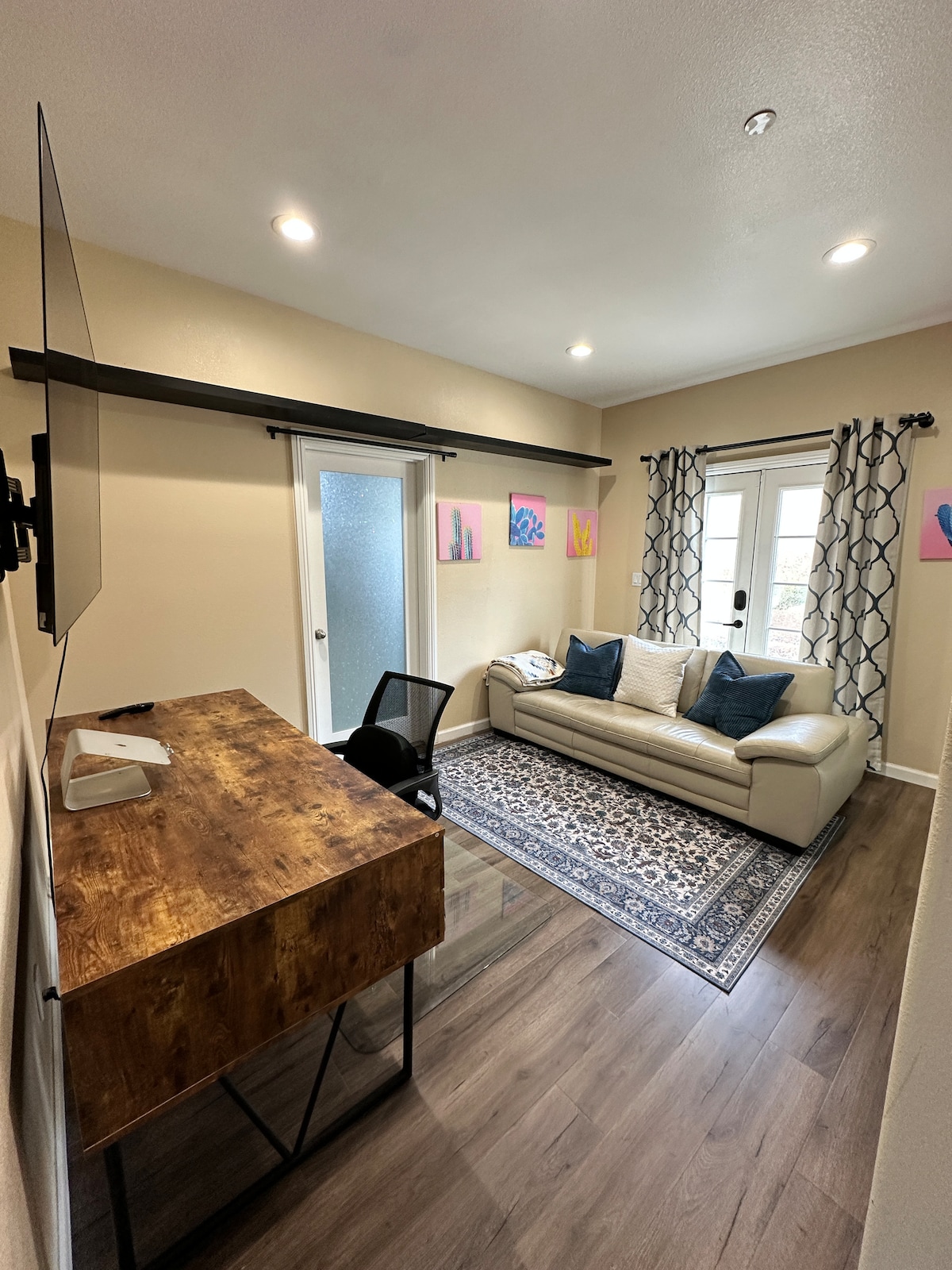 You will stay in a tranquil suite with a private entrance at the rear of our home. There is a shared wall with a secure door with locks on both sides for complete privacy. The 1-bedroom 1-bath suite features a kitchen with air fryer/toaster oven, electric skillet, 2 hot plates, microwave, refrigerator, and dishwasher. Sofa full size converts to sleep two. This sofa bed in the living room provides additional sleeping. We can provide a twin size aero bed as well.