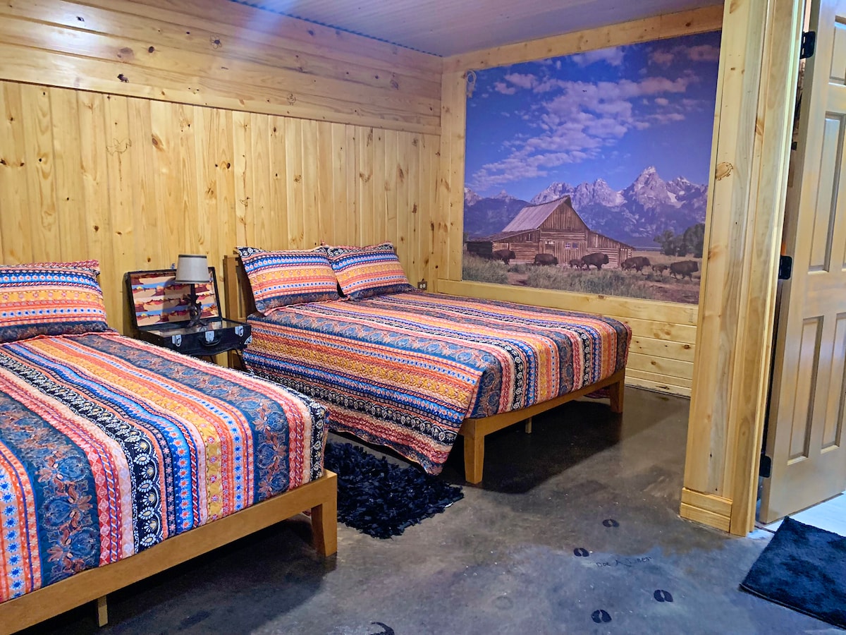 Después de un día lleno de aventuras al aire libre, relájate en nuestra cabaña Seek and Snore. Nuestros nietos nos inspiraron para crear esta cabaña temática «Veo, veo» que muestra algunas de sus cosas favoritas vistas mientras exploramos el Refugio de Vida Silvestre de las Montañas Wichita, que está a menos de 3 millas de distancia. Ubicado a los pies de las montañas Wichita, The Lazy Buffalo cuenta con 13 cabañas temáticas individuales y una litera. La cabaña Seek and Snore tiene capacidad para 4 personas con 2 camas tamaño queen.