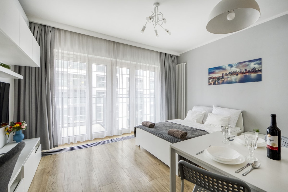 🌿 SuperApart City Centre: ¡elegante estudio con balcón en el corazón de Varsovia! ✨ Bienvenido a un estudio luminoso y funcional situado a pocos pasos de Plac Trzech Krzyży, perfecto para dos huéspedes que quieran explorar Varsovia 🌇 Situado en la 10.ª planta con ascensor, el apartamento cuenta con un acogedor balcón con una encantadora vista de la ciudad, ideal para un café por la mañana o un descanso por la noche 🌿