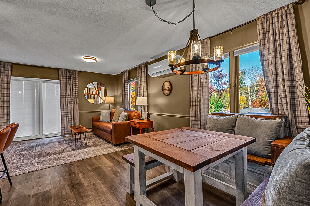 Esta es una casa de huéspedes renovada que fue construida en 1940. Tiene excelentes características de la década de 1940, como suelos de madera, techos altos y ventanas a gran escala. Quitamos 2 paredes principales, lo que abrió la cocina/comedor/sala de estar, a un gran espacio. La casa de huéspedes ahora tiene una sensación abierta y luminosa, con una decoración funky de mediados de siglo. Nuestra propiedad consta de 3 acres, pero está a solo una manzana del centro de Boone. El entorno exterior es muy aislado y natural, con una ladera boscosa, un arroyo y un gran patio.