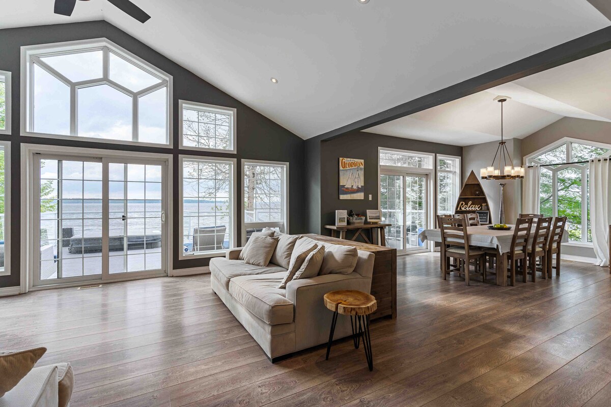 Moderna casa de campo con vistas al atardecer de la bahía Georgiana, justo en el sendero pavimentado de Tay Shore para correr, andar en bicicleta o en raquetas de nieve. ¡Recién renovada de arriba abajo! Disfruta de la terraza de 500 pies cuadrados con jacuzzi, barbacoa y mesa de patio durante todo el año. Fogata en el patio trasero. La casa está en un solar grande rodeado de árboles de hoja perenne para mayor privacidad. Al otro lado del sendero se puede acceder al agua, a 5 minutos a pie de una playa de arena. A 1,5 horas de Toronto, a 30 minutos al norte de Barrie, a 12 minutos del monte St Louis Moonstone para esquiar.