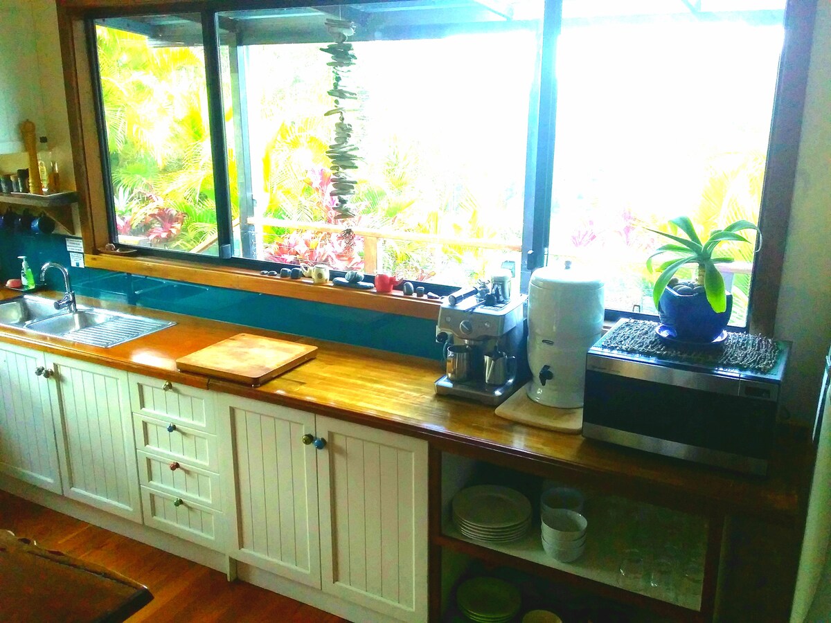 The Nutty Bungalow is an elegantly fitted out space and on an organic Macadamia nut farm.. strolling distance to long quiet beaches. .. a place of peace and simplicity and comfort... whatever the weather or season or reason. Open fireplace with wood provided for snuggly nights. Big, huge smart TV ... On the same property as my house but private with an orchard in between & far enough that noise doesn’t travel between much. Dogs are welcome if they've been discussed & the dog rules agreed to..