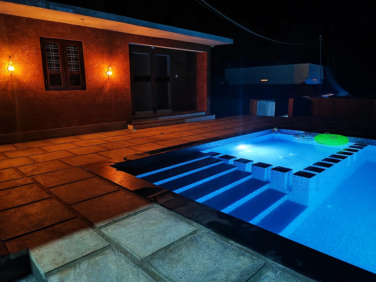 Bienvenido a nuestra acogedora villa en una propiedad vallada de 1 acre en el idílico y pintoresco pueblo Koleri en Wayanad. Minimalista sin comprometer las necesidades es el tema que adoptamos. Camas limpias, almohadas frescas, mantas, toallas , jabón , champú, inodoros limpios y baño con ducha de agua caliente son nuestras ofertas para todos los huéspedes. Seguimos las pautas gubernamentales sobre los protocolos de desinfección. Un destino de escapada perfecto para relajarse y disfrutar de una experiencia estelar en el campo.