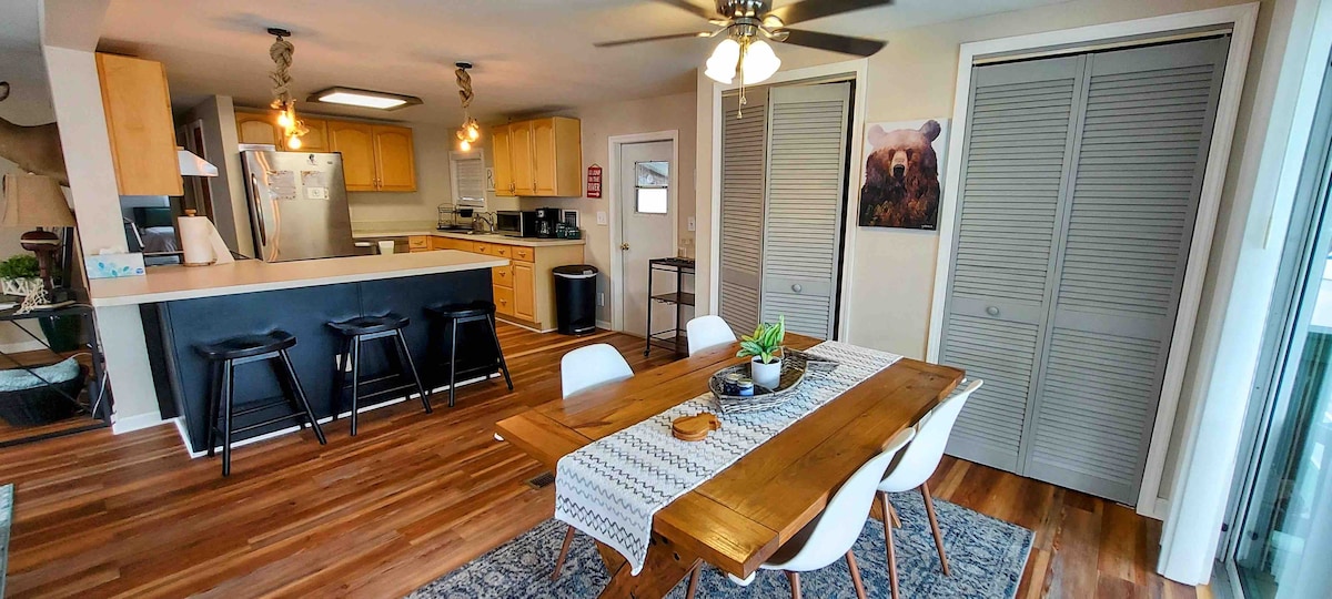 Escápate a nuestra casa totalmente renovada con una decoración rústica de estilo granja que es luminosa y acogedora. Está situado en un terreno doble en un tranquilo canal en el río Weeki Wachee. La casa cuenta con una suite estudio independiente con una cama tamaño king con su propia cocina pequeña, sala de estar con sofá cama de tamaño completo, TV de 50 pulgadas y baño completo. Arriba hay 2 dormitorios y baños adicionales. La cocina de arriba está totalmente equipada e incluye cafetera y tostadora. ¡Este alojamiento es un espacio ideal para familias grandes!