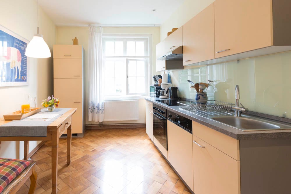 Al sur y con vistas al campo se encuentra el apartamento Ritter» - un espacioso apartamento de 3 habitaciones. Los grandes árboles antiguos proporcionan sombra y tranquilidad. Un dormitorio con cama doble, un segundo con 2 camas individuales (ambas con armarios empotrados) y un nuevo y cómodo sofá cama en la sala de estar con capacidad para una familia de cinco personas. (Por supuesto, también tenemos todo lo necesario para los niños pequeños). La sala de estar incluye una mesa redonda, pero también la esquina con la televisión inteligente.