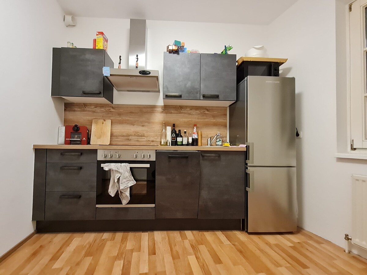 Hermoso edificio antiguo justo en el centro de la ciudad de Wels. 84 m² de espacio habitable, dormitorio muy espacioso, baño, cocina totalmente equipada y sala. En la cama tamaño king de 200 x 200 cm hay suficiente espacio para dos personas. En la sala de estar hay un sofá y un ala. Los terrenos de exposición están a 15 minutos a pie, con muchas cafeterías, restaurantes y bares cerca.