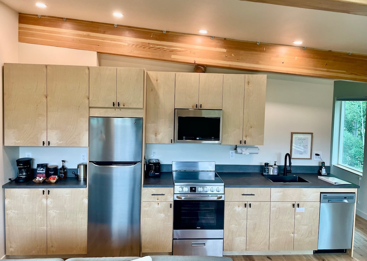 «The Shedd» solía ser un cobertizo antes de que nuestro arquitecto se apoderara de él y lo convirtiera en un refugio para escribir, leer y dormir la siesta. La casa de huéspedes de 800 pies cuadrados tiene un dormitorio, baño con ducha a ras de suelo, pequeña cocina, comedor, sala de estar, escritorio, wifi y aire acondicionado. A pesar de que está a solo 7 minutos a pie del pueblo, nuestro alojamiento está respaldado por la naturaleza, con excelentes vistas a la montaña Tumwater y a Icicle Ridge. Lo mejor de todo es que The Shedd tiene muchas ventanas y mucho aire fresco y luz natural.