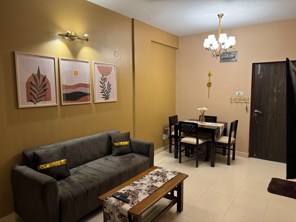 Welcome to your comfortable home in Greenfield City, Behala. This spacious 2BHK apartment is perfect for families, couples, and business travelers looking for a relaxed and well-connected stay. Both bedrooms are fully air-conditioned, ensuring a comfortable sleep after a long day. The living room features a large 50-inch Smart TV, a comfortable sofa, and a warm, inviting setup to unwind or enjoy your favorite shows. A dedicated dining table makes it easy to enjoy meals together.