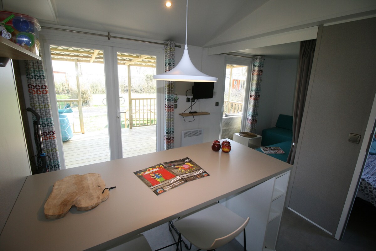 Casa móvil para 4 personas de 2018 con terraza privada. Cocina equipada con nevera, microondas, estufa de gas, Senseo. Televisión por cable, WIFI y calefacción eléctrica. Dormitorio principal y dormitorio para niños. Ducha y aseo privados. Campo de césped privado con mesa de picknick, mesa de juegos acuáticos para niños y tienda de campaña (solo en verano) Estacionamiento privado directamente junto a la casa móvil.
