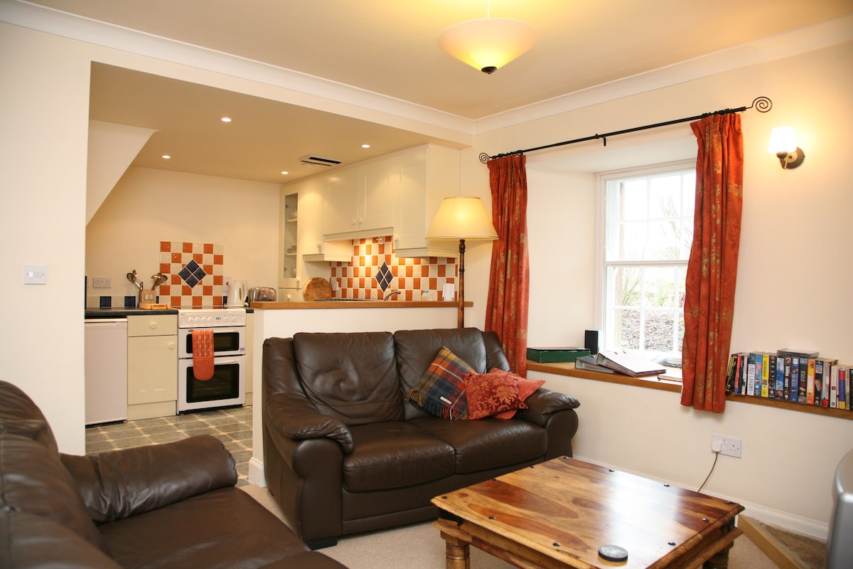 Cosy 1 bedroom private cottage in Buchanan Castle Estate, short walk to Drymen & WHW access. Bedroom with king size bed & ensuite shower room, with the option to turn the sofa in the lounge into king size bed (toilet via bedroom). Kitchen has hob, oven, grill, fridge/small freezer, kettle, toaster, coffee machine and breakfast bar. Welcome pack on arrival. Towels & linen provided. Comfortable lounge area with Smart Tv & Wi-fi. Fully heated Private parking & lockable gates. Private Garden.