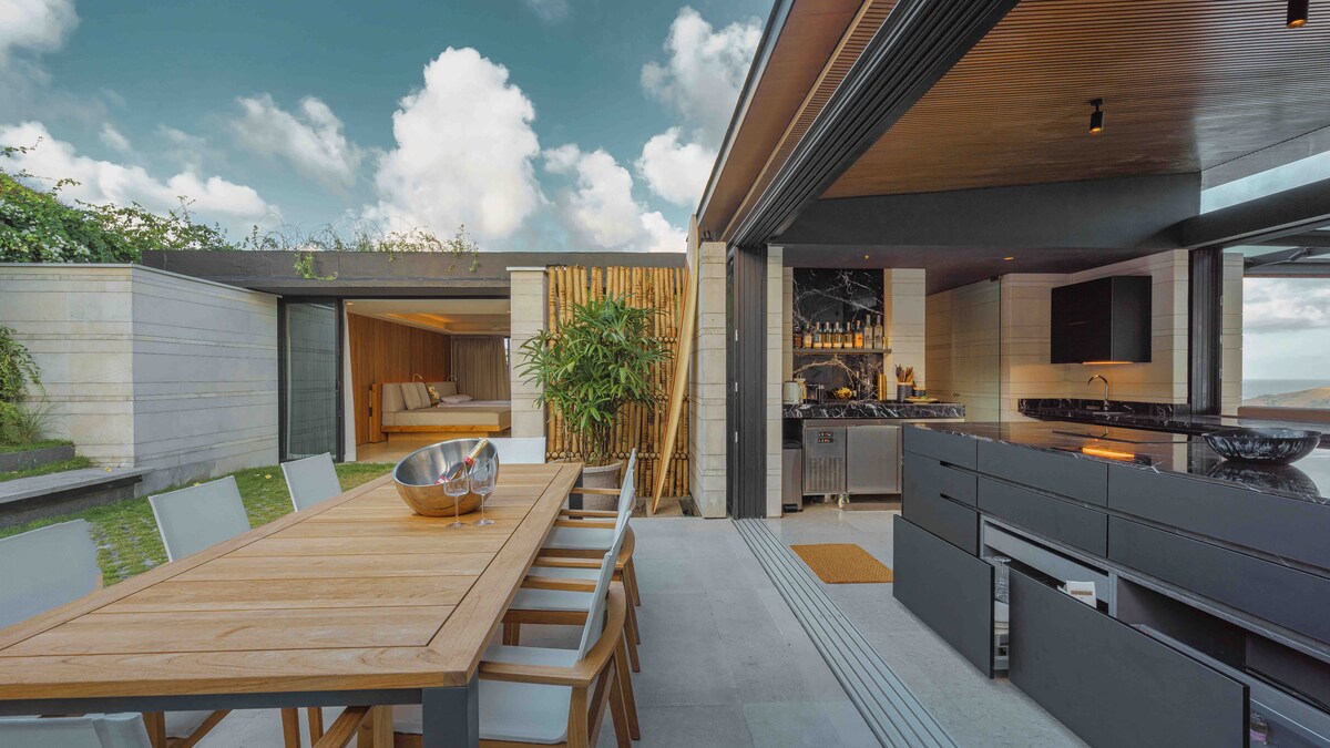 Ubicada en un jardín tropical de una hectárea con impresionantes vistas al mar, esta villa tradicional javanesa está diseñada para ser respetuosa con el medio ambiente, con refrigeración pasiva al aire libre, cosecha de agua de lluvia, electrodomésticos de baja energía y agua calentada con energía solar.