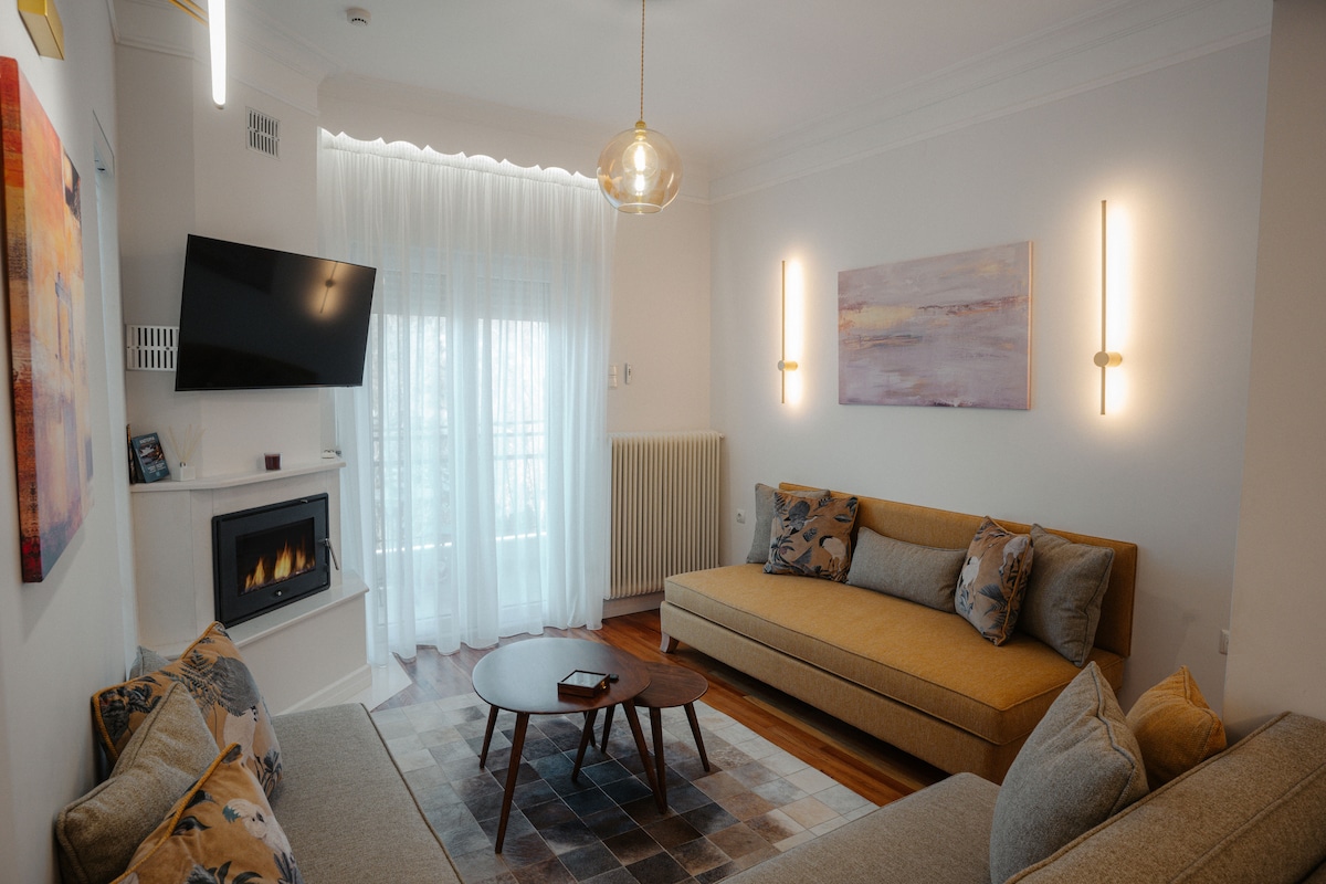En el corazón de Ptolemaida, justo en la calle Vasilisis Sofias, encontrarás nuestro precioso loft. Diseño interior totalmente personalizado/hecho a mano inspirado en la estética escandinava y japonesa. Piensa en suelos con textura de madera, telas con textura de seda, colores suaves terrosos, luces ambientales inteligentes y una vista directa al monte Askion (Siniatchko). Disfruta de una experiencia de cine privada con un proyector inteligente que se proyecta en una pared de 170 pulgadas y una justo desde tu cama.