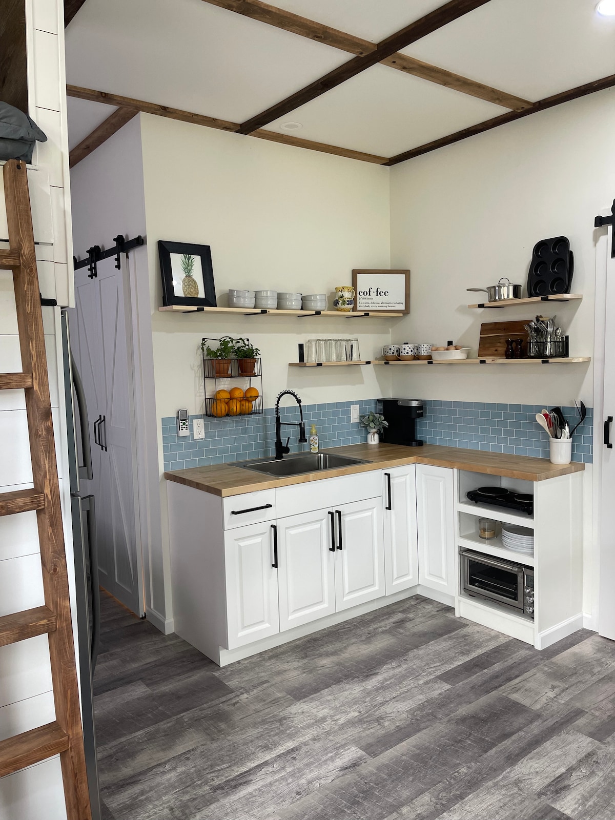 Este alojamiento único tiene personalidad propia. Sala de estar moderna. Acogedor loft con cómoda ropa de cama. Mesa de comedor para 6. El dormitorio tiene una cama tamaño queen. La cocina está totalmente amueblada y ofrece suministros de café, placa caliente para cocinar, máquina de palomitas de maíz, horno tostador multiusos y nevera de tamaño completo. La sala de cine tiene 4 asientos reclinables de cuero y un sofá cama. Pantalla gigante y proyector con sonido envolvente. Techo estrellado mientras ves tu película favorita en streaming. A 12 millas del océano.