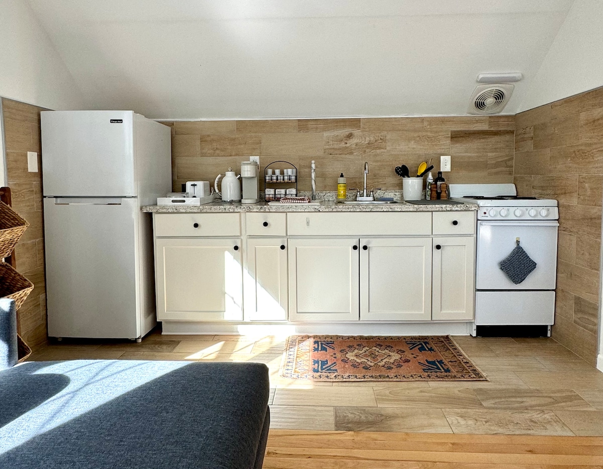 Granero de 1800 que era el granero original de la Mansión del Gobernador Yates, que ahora alberga un estudio tranquilo y pintoresco de 400 pies cuadrados de "concepto abierto" en el segundo piso. Terraza privada al aire libre, estacionamiento fuera de la calle. Mucho carácter, incluyendo revestimiento de tablas en las paredes y el techo, y suelos de madera viejos. Cocina totalmente equipada con nevera de tamaño completo, cocina de gas, microondas, tostadora, cafetera, platos, cubiertos, olla y sartenes. Baño completo con ducha de pie más pequeña. Cama tamaño queen.