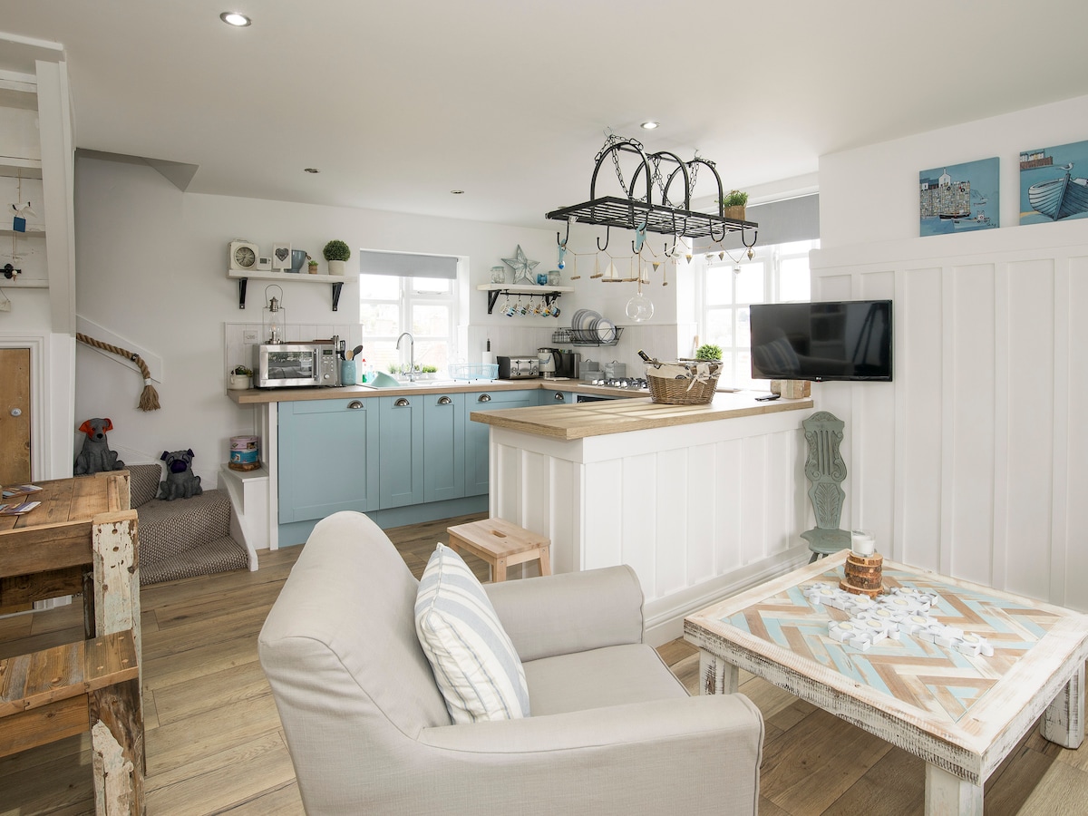 Encantadora y acogedora casa de campo en el puerto, en el corazón del lado este de Whitby. Situada en un patio tradicional junto a Sandgate, con vistas al puerto. Salón con estufa de leña, gran sofá de esquina y ventana al puerto, cocina hecha a mano con gama original y electrodomésticos modernos. Baño familiar con ducha a ras del suelo. Dos dormitorios arriba, tamaño king con ventana al puerto, doble con ventana a un patio tranquilo. Permiso de estacionamiento gratuito para el aparcamiento de Abbey Headland. Wifi de fibra superrápido, TV inteligente.