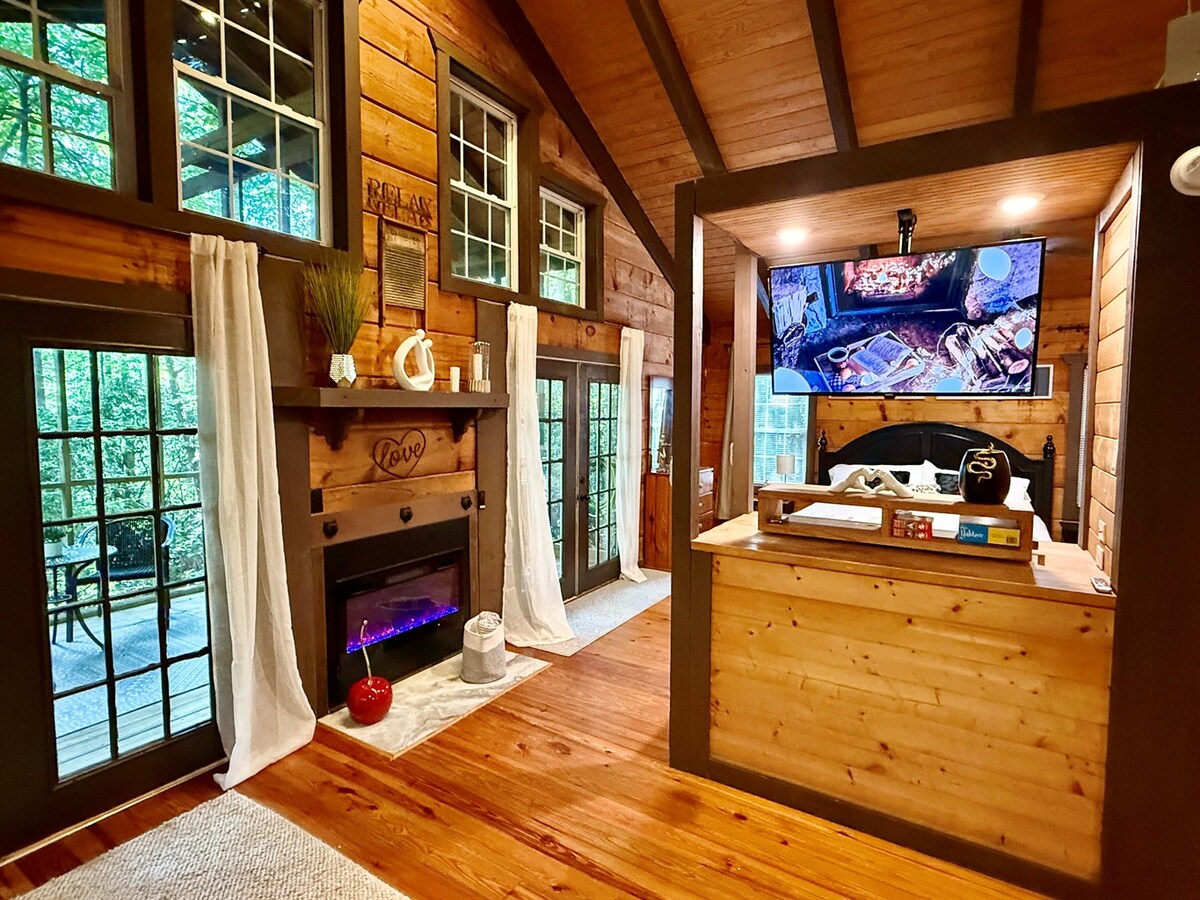 Escápate a nuestra única cabaña nórdica con ventana en la cima de un árbol enclavada en un sereno bosque de 22 acres. Disfruta de impresionantes vistas al bosque desde amplias ventanas, relájate junto a la chimenea de gas y cena en la mesa de picnic. La casa de baños independiente ofrece un toque de lujo, mientras que una hamaca invita a la relajación entre los árboles. Con una ubicación céntrica, estás a solo 5 minutos de Helen alpina y cerca de cascadas, viñedos, senderismo y pesca.