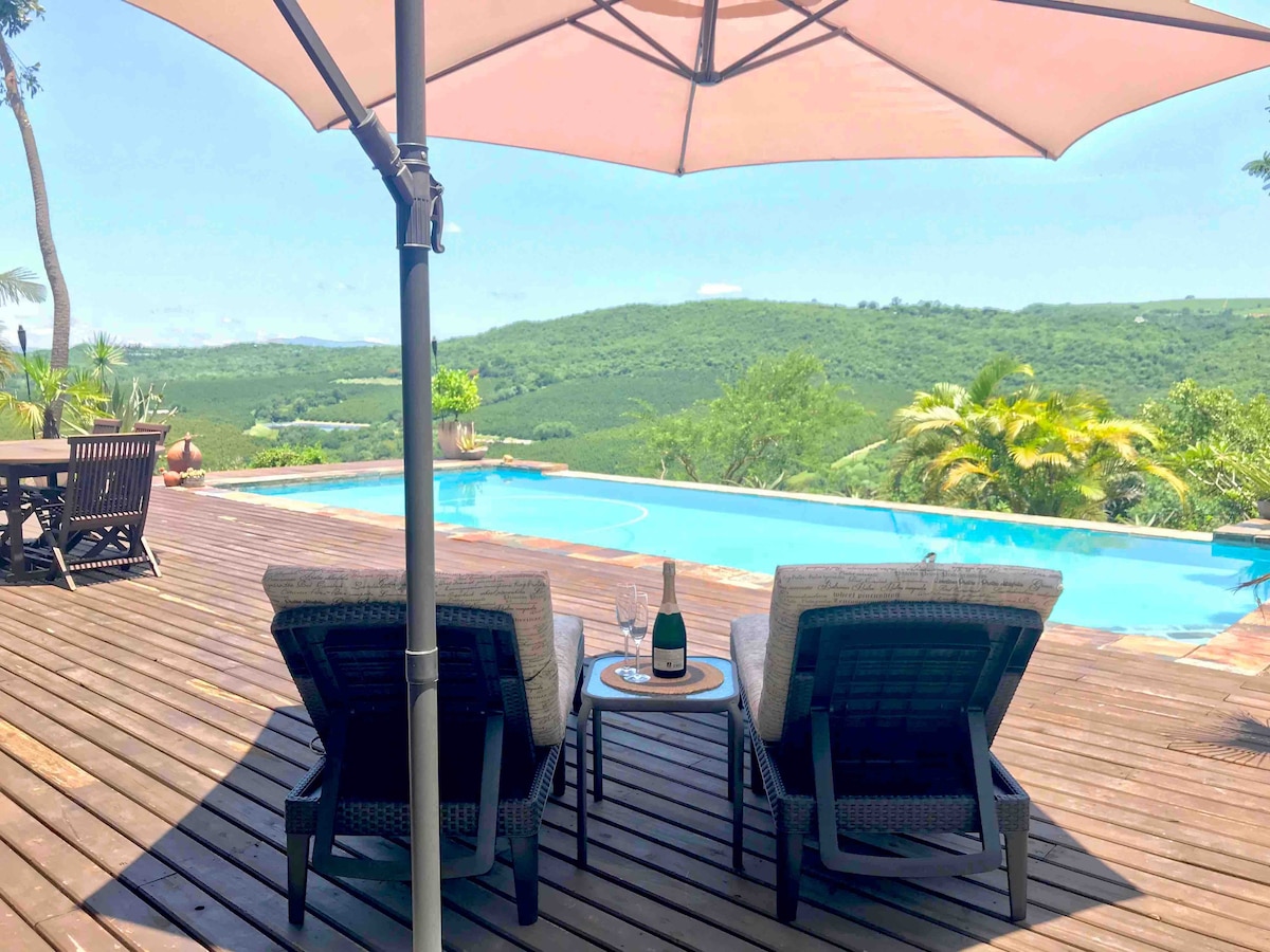Disfruta de privacidad en nuestra cabaña independiente en Hill Top Villa. La cabaña de 43 metros cuadrados tiene una hermosa vista al valle y al monte. Hay una pequeña cocina y una sala de estar con un televisor de 50 pulgadas, un cómodo sofá y DSTV limitado. Hay dos lavabos y una ducha en el baño. Hay un lugar para hacer barbacoas con utensilios. La cama tamaño king se puede configurar como dos camas individuales previa solicitud. Los huéspedes de la cabaña pueden hacer uso de la piscina en el nivel superior de la propiedad, no se encuentra en la cabaña.