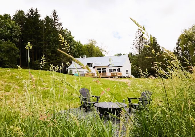 Cabaña de nueva construcción junto al río con vistas a 600 pies de orilla privada justo en el borde de Livingston Manor. Los techos altos de la cabaña y los grandes ventanales crean un espacio lleno de luz y grandes vistas al río Willowemoc: pasea por la orilla para pescar con mosca uno de los ríos más famosos de la zona o simplemente disfruta mirando desde tu propia terraza privada. Después de la puesta de sol, disfruta de la chimenea al aire libre o de la chimenea cubierta de piedra, o cocina un banquete desde la cocina del chef.
