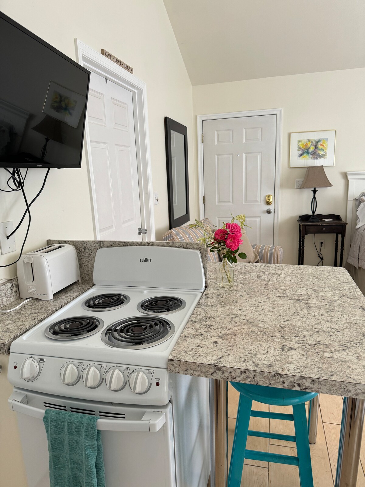 ¡Hola! Nuestro apartamento tipo estudio es perfecto para aquellos que buscan una escapada tranquila y acogedora. Está situado en el centro entre Rehoboth y Lewes y muy cerca de la ruta 1 y la ruta 24. El estudio tiene una entrada privada en el lado izquierdo de nuestra casa. Consta de una habitación grande con amplios espacios para vivir y dormir, que incluyen una cama tamaño queen, un cómodo sofá de dos plazas y un vestidor. Un baño con lavabo doble tiene muchos estantes para toallas y artículos de aseo. Hay aparcamiento fuera de la calle para 1 coche.