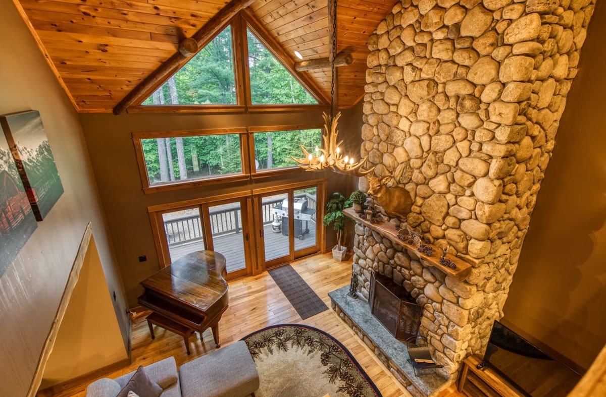 Situada en una zona boscosa aislada, esta propiedad se encuentra a solo una milla de Whiteface Mountain y del famoso río AuSable. La casa ofrece a los huéspedes 3500 pies cuadrados con un estilo tradicional de Adirondack, con muchos elementos rústicos incorporados en un diseño contemporáneo. Estas incluyen características como un plano de planta abierta con techos de catedral de 30 pies en la sala de estar y calefacción radiante en el suelo, chimenea de leña, encimeras de granito, suelos de madera dura y barandillas de troncos.