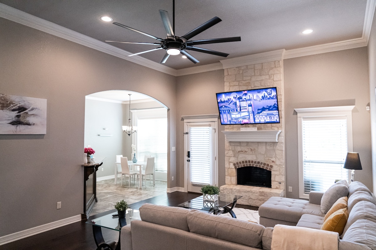 Welcome to our private oasis nestled within the city limits! This 4400 sqft home, 10-acre estate sleeps 10 and features a gourmet kitchen, pickleball, private 2-acre pond w/ covered dock, swimming pool, spa and fire pit. Relax in the screened patio, 2 family rooms, and a master bedroom fit for royalty. With an office and laundry, this retreat offers both luxury and convenience. The backyard is canopied under huge oak trees, resembling a beautiful park. Only 1-mile from shopping and restaurants.