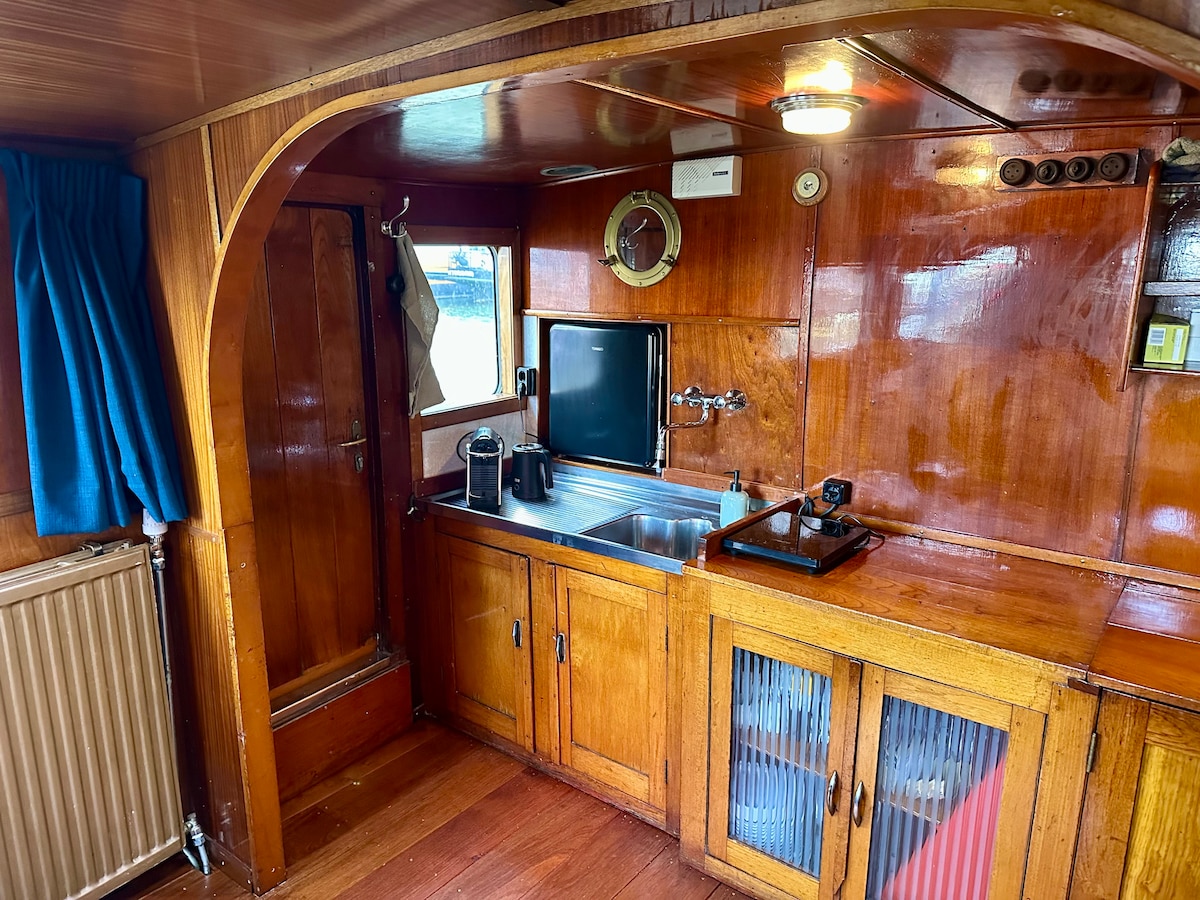 On this authentic boat you can live like a Rotterdammer, on a fantastic location right in the center of the city. The apartment on the Animathor has been completely renovated, but is still very much a boat. Your apartment is in the front of the ship. It has a private entrance, kitchen, a deck terrace and a fantastic view. The boat has three levels, there is a salon, a bedroom and bathroom below and a roof terrace on the top deck. You can reach the boat by an easy gangway.