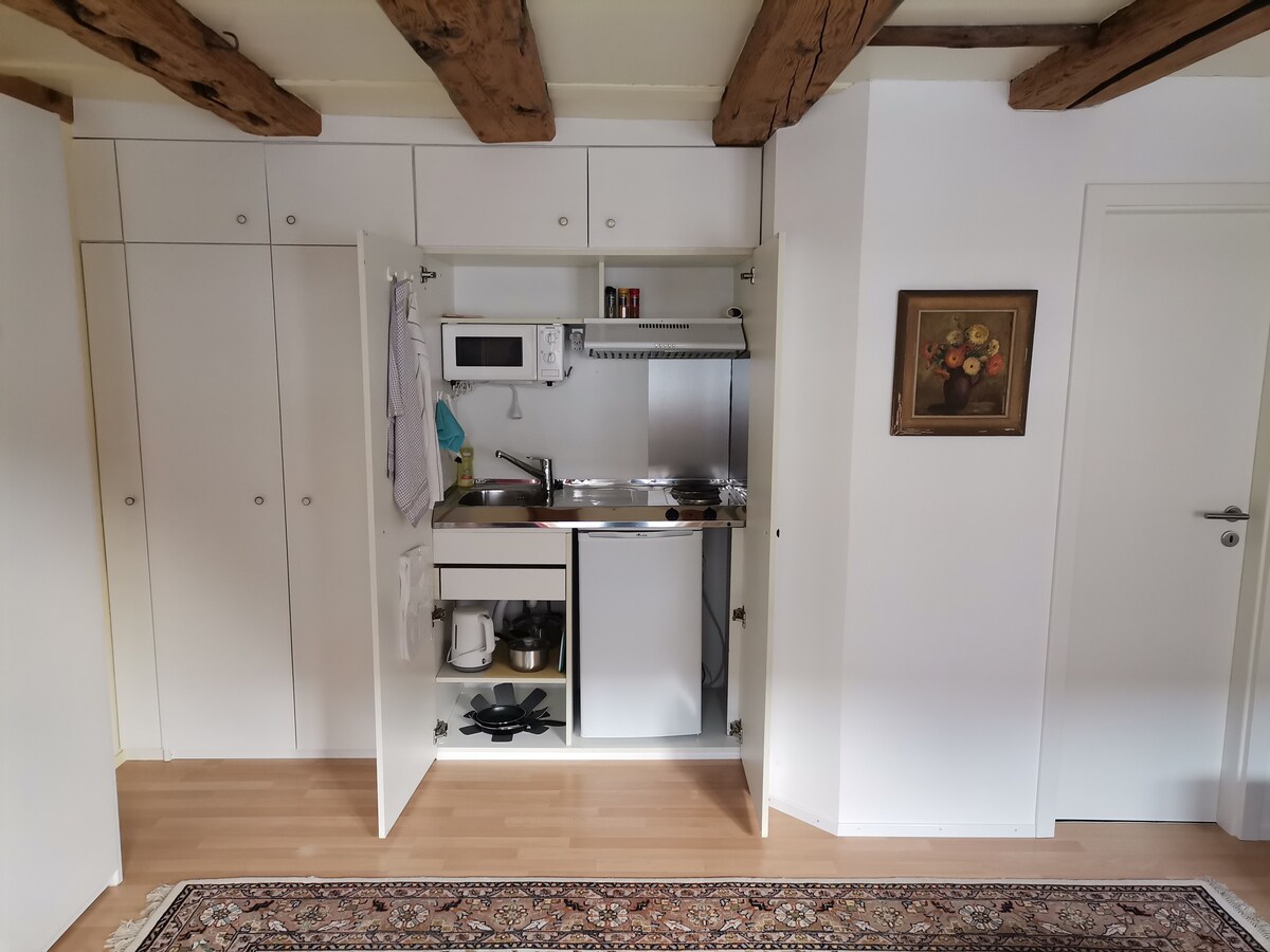 Nuestro ático, decorado con mucho cariño, ático en una casa de campo del siglo XVI es tranquilo y céntrico. Podrás relajarte dando largos paseos por los hermosos bosques o por la idílica orilla del Rin, con sus numerosos lugares de baño. En 5 minutos se puede llegar a pie a restaurantes, supermercados, piscina y estación de tren. Jestetten es el punto de partida ideal para excursiones a destinos como la Selva Negra, el lago de Constanza, Zúrich y los Alpes. Los trenes a Zúrich y Schaffhausen salen cada media hora.
