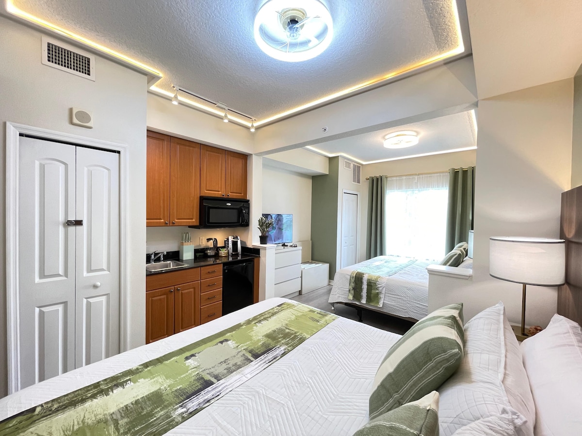 Moderno, espacioso y sereno, este estudio ofrece hermosas vistas al lago y a la piscina desde su propia terraza privada, perfecta para relajarse después de un día de aventura. Con una ubicación ideal a poca distancia de International Drive, estarás cerca de las principales atracciones, restaurantes y tiendas de Orlando. Disfruta de una comodidad inmejorable con Universal Studios/Epic Universe a solo 5 minutos y los parques de Disney a solo 15 minutos. Sin depósito ni cargos adicionales.