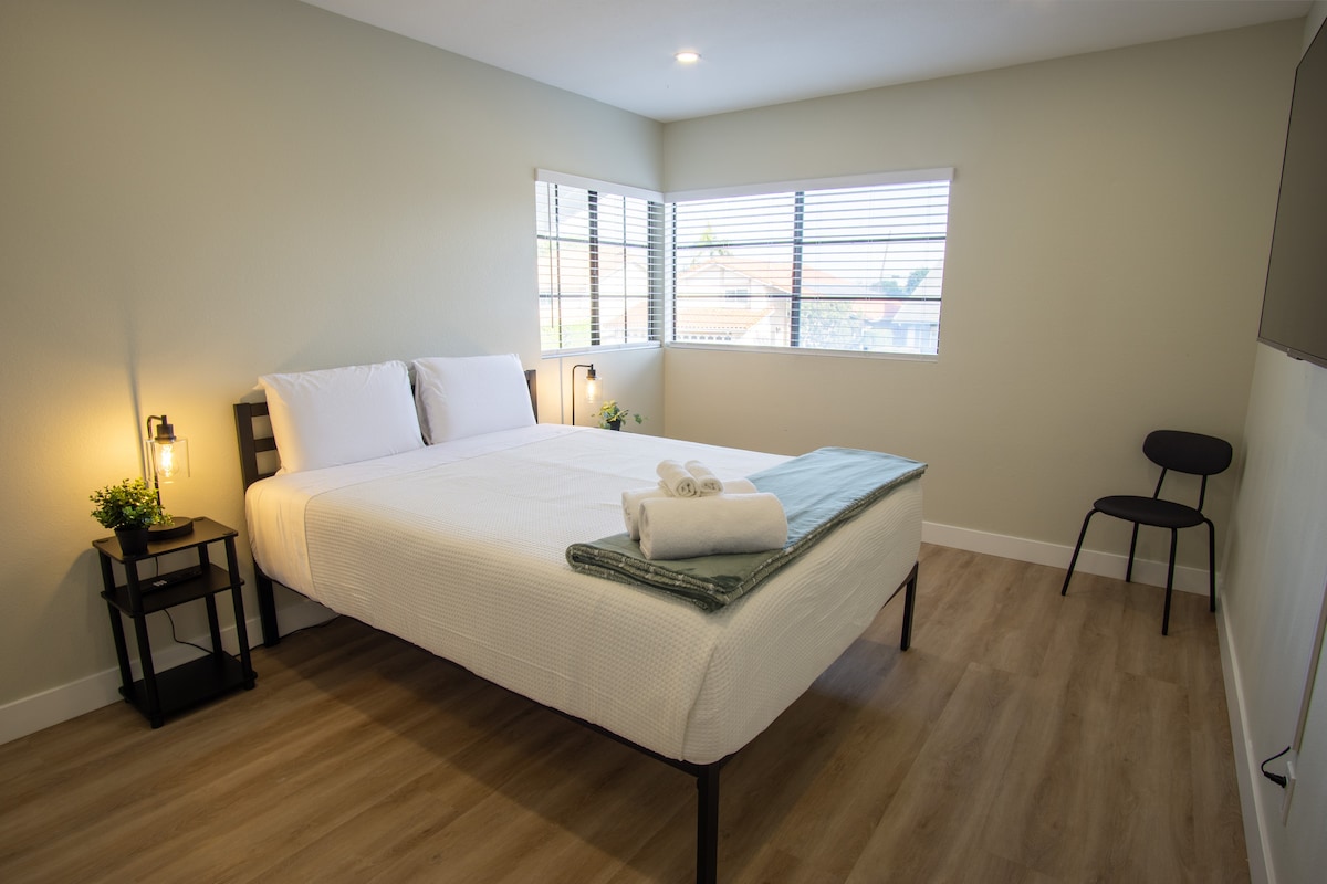 Suite principal de un dormitorio✨ recién remodelada, limpia y acogedora en el primer piso con baño adjunto y entrada privada • 10 minutos de ⇆ Disneyland • Sin toque de queda, registro de entrada autónomo • Estacionamiento gratuito en la entrada en un vecindario seguro y tranquilo. • Cama cómoda + sábanas prémium • Wifi rápido, aire acondicionado, purificador de aire, Smart TV, mininevera • Ubicación conveniente y acceso rápido a la autopista • Microondas, cafetera, hervidor de agua caliente • Patio exterior privado grande y relajante con tumbona. • 5 minutos ⇆ Knott's, restaurantes, tiendas • Toallas de playa. • Artículos de aseo