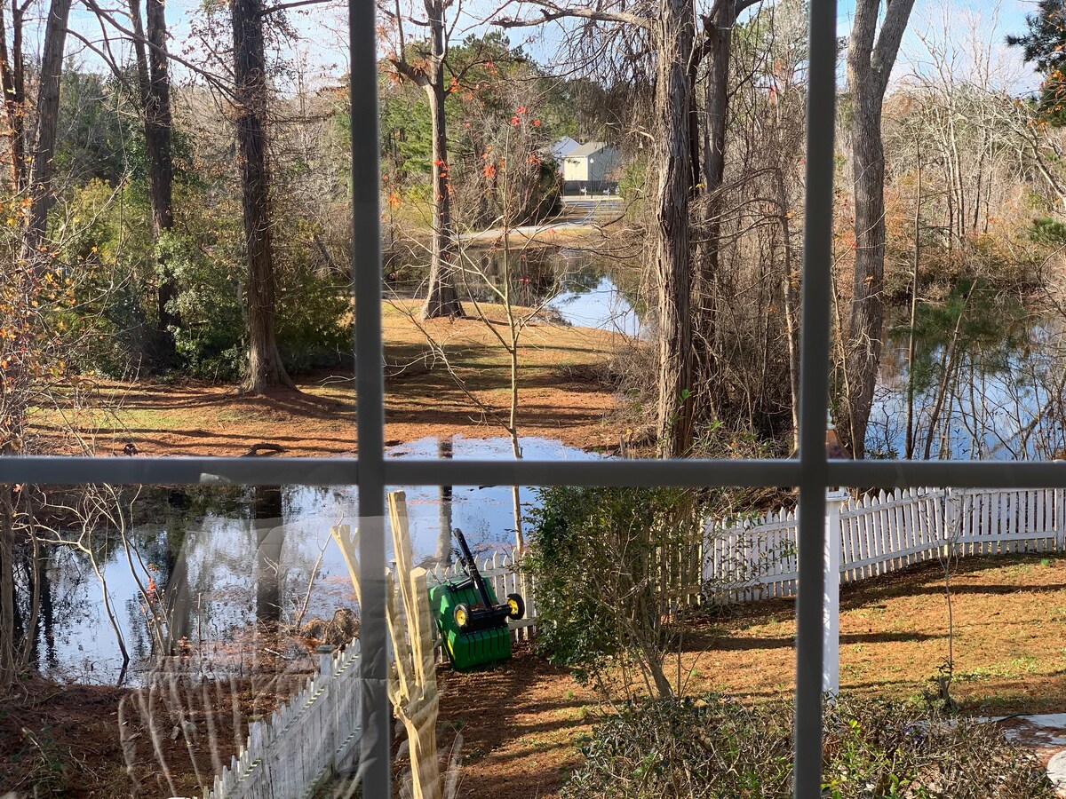 This studio guest house has a private entrance with pond and pool view from the room. The cover photo is one of Wilmingtons sunrise at the beach. This cozy room has a comfortable King bed, 1 pull out sofa couch. Your own private bath stocked with towels and mini toiletries if you forget them. The neighborhood is very quite and safe. I have a coffee maker and cups for the morning cup of joe.