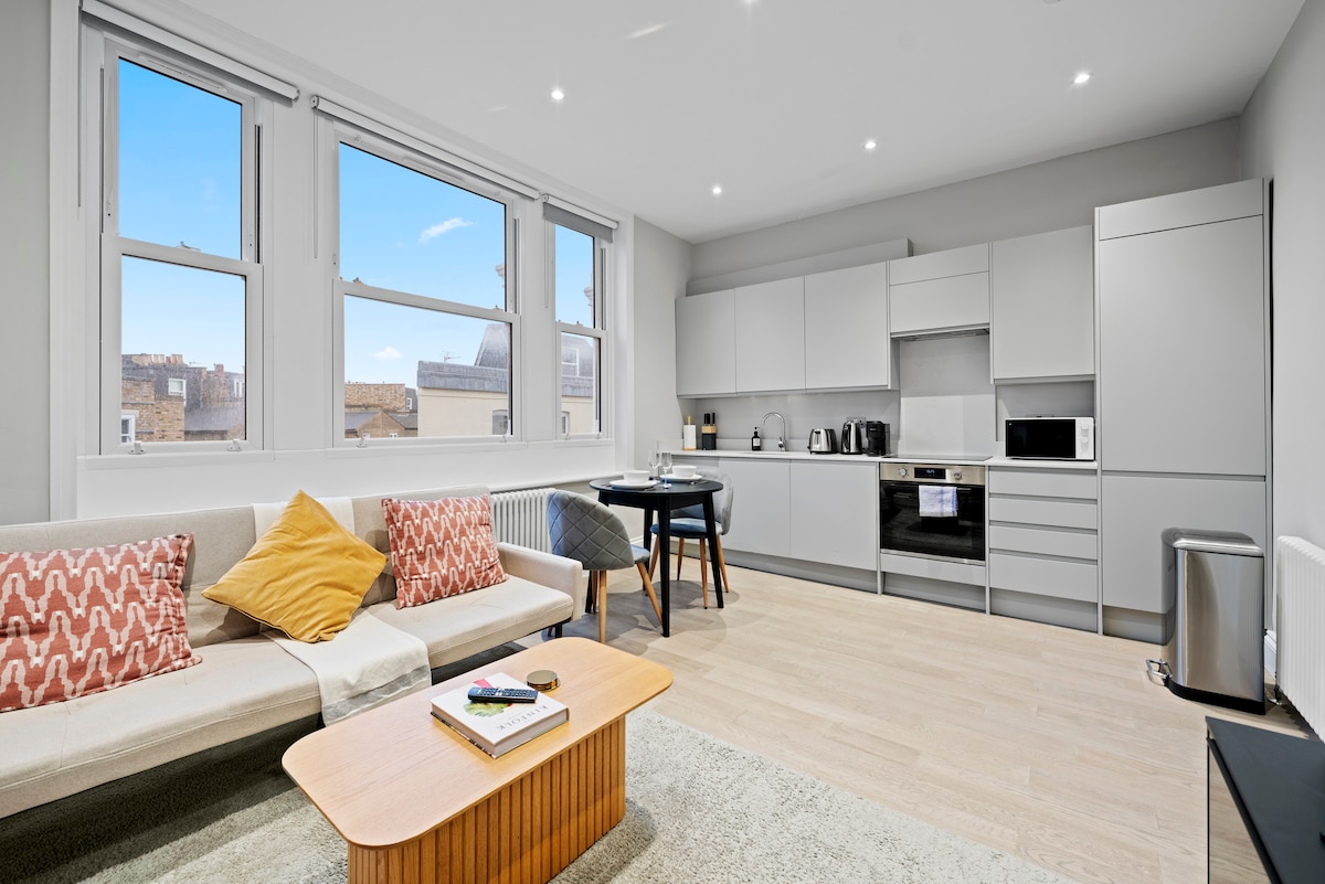 • 500 pies cuadrados 3er piso 1 dormitorio/1 baño con techos altos • Apto para niños con cuna de viaje, trona, puertas de seguridad y parque infantil cercano. • Camas: 1 cama de espuma Super King (180 cm de ancho), colchones de tres pisos (64 cm) y un sofá. • Limpieza profesional con sábanas de 500TC y todos los servicios imaginables. • Wifi (100 Mbps), TV inteligente, altavoz, secador de pelo, ventilador Dyson, lavadora y secadora. • Otras opciones: www.airbnb.co.uk/s/homes?host_id=1408974