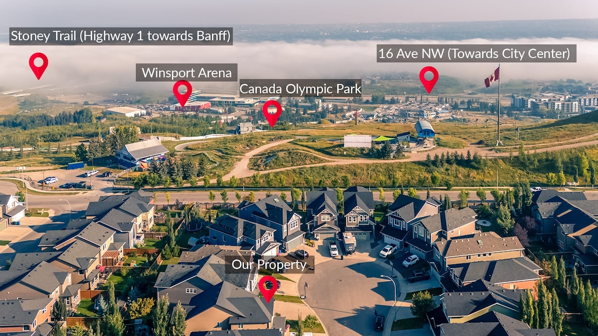Disfruta del invierno y relájate en este alojamiento tranquilo y elegante. Disfruta de la privacidad de una casa totalmente independiente con vistas al Parque Olímpico de Canadá (Winsport) y a las puestas de sol. Características de lujo que incluyen aire acondicionado central, encimeras de cuarzo, suelos de madera y bañera de aire rejuvenecedor. ¡Ubicado a pocos pasos del río Bow y con acceso rápido a la autopista Transcanadiense (autopista 1) para tus aventuras en la montaña! Incluye garaje privado con calefacción individual y aparcamiento fuera de la calle para tu estancia corta o larga.
