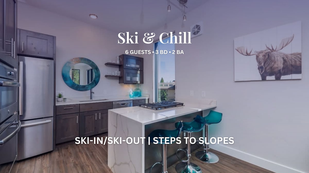 1 cama extragrande en Zephyr Lodge, los únicos condominios de entrada/salida con esquí de WP. 20% más grande que otras 1 camas con vistas a las pistas y al pueblo. Cama tamaño king en el dormitorio + cama tamaño queen en el salón. Servicios: unidad de aire acondicionado en la ventana, taquilla para esquís en la planta baja, bañeras de hidromasaje al aire libre y gimnasio. Un estacionamiento subterráneo privado para huéspedes (verano gratis/invierno $30/día). ¡Cerca de Starbucks, alquiler de esquís, tiendas y restaurantes!