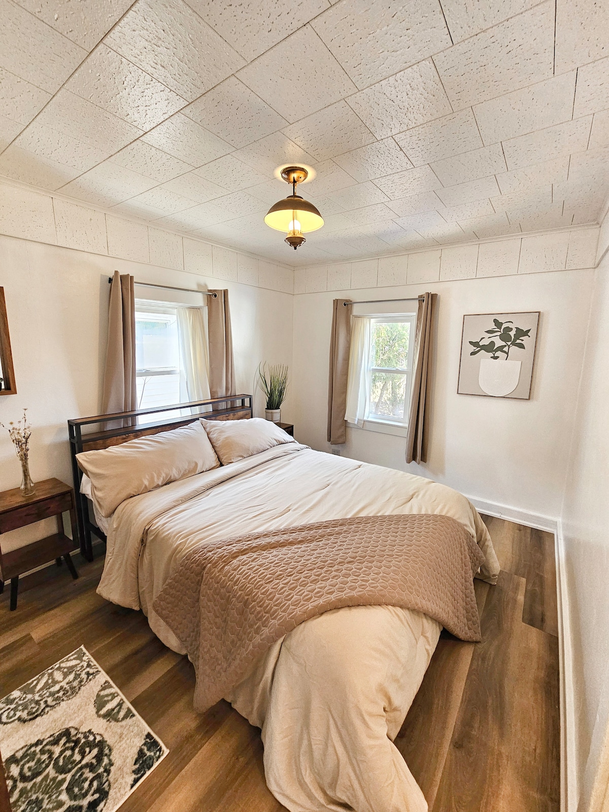 Enjoy this great space in a quiet safe neighborhood. One car allowed at the property! The space has comfortable beds, provided hygiene products, a smart TV and snacks + beverages. Wake up and enjoy coffee provided by us. Shops and restaurants within walking distance! Visit The Plaza downtown with ice skating, fire pits, a coffee shop and more. Great for a couples getaway. Luxury for a great price! A portion of the proceeds from bookings go to housing evacuees, refugees and veterans.