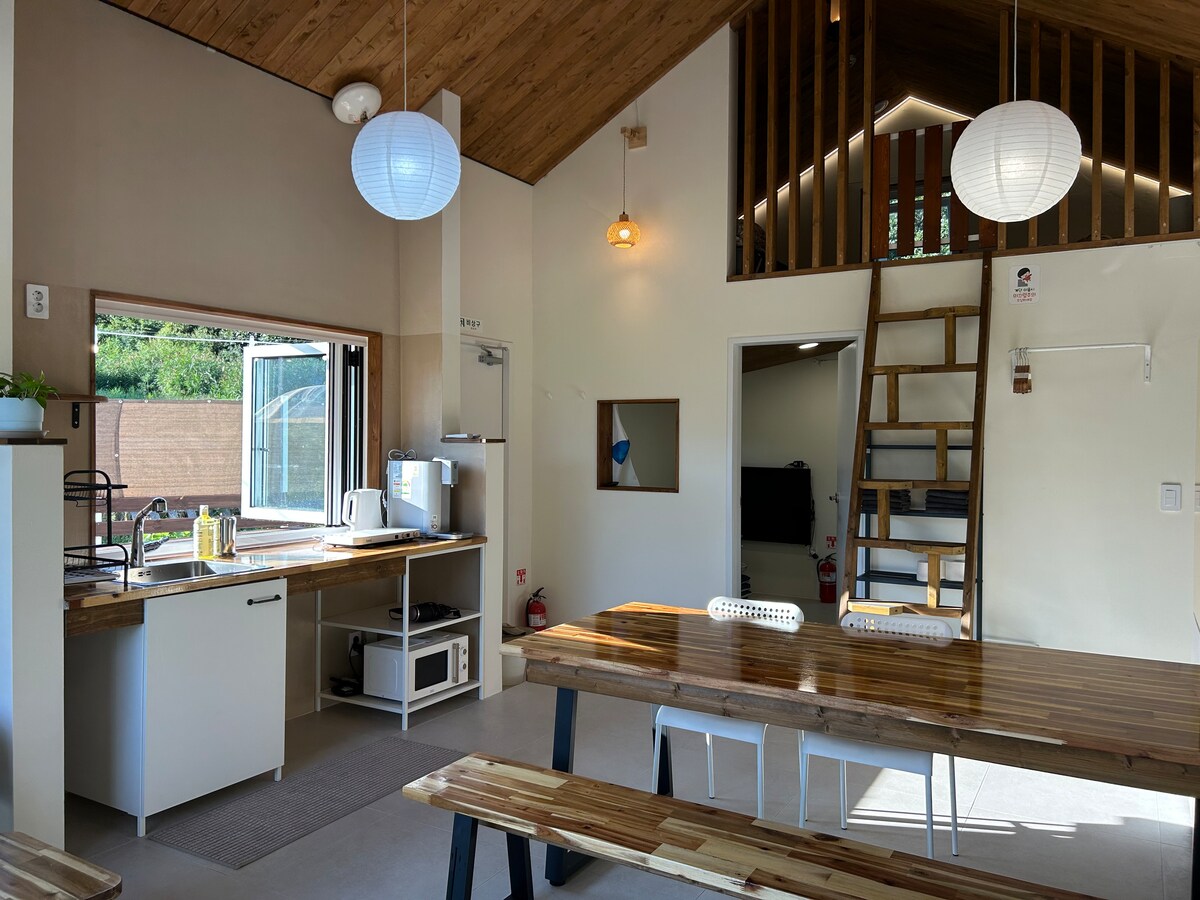 aeyhaus es una casa independiente tranquila de dos pisos con vistas a una impresionante casa montañosa. Puedes disfrutar del paisaje natural que cambia con las estaciones, ganar estabilidad mental y física y sanar, y la tranquilidad y privacidad del entorno circundante están garantizadas. Hay una sala de estar, cocina y aseo en el primer piso, y dos dormitorios y un baño en el segundo piso. La ropa de cama se lava todos los días y la limpieza es la máxima prioridad, por lo que la satisfacción de los huéspedes es alta. Los muebles interiores sensacionales y una gran variedad de vajilla también son otra jactancia. Se recomienda tomar un té relajante o disfrutar de un pícnic sencillo mientras se contempla el cuidado césped azul y los hermosos parterres, y en invierno, disfrutar de la vista de la montaña nevada desde lejos o pasar un rato frente a la chimenea. Esta casa, que pretende ser el mejor alojamiento preferido por los huéspedes, es un lugar donde viven y cultivan parejas de jubilados. Esperamos que pases un rato cómodo y feliz en casa con tu familia, amantes y amigos en un espacio cálido con un estilo de mediados de siglo.