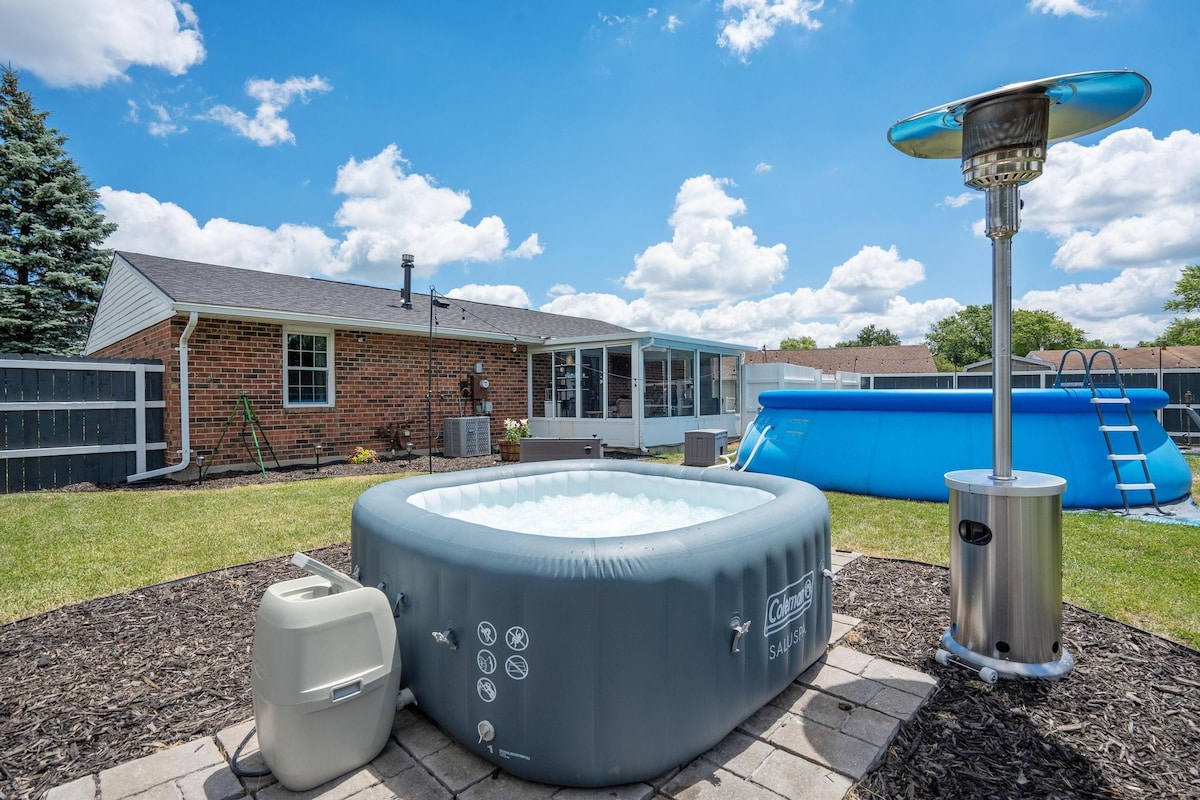 Olvídate de tus preocupaciones en este espacio espacioso y sereno a solo 2 millas del anfiteatro Rose y a 10 minutos del centro de Dayton. El espacioso patio trasero está equipado con 113 jacuzzis con chimenea y una relajante cascada. El solárium es un gran lugar para comenzar el día con café/crema complementaria. Completo con 4 televisores y una computadora. La sala de estar tiene un Nintendo Switch para la diversión familiar. Ten una parrilla de carbón y de gas. Tenga en cuenta que la piscina se desmonta en septiembre.