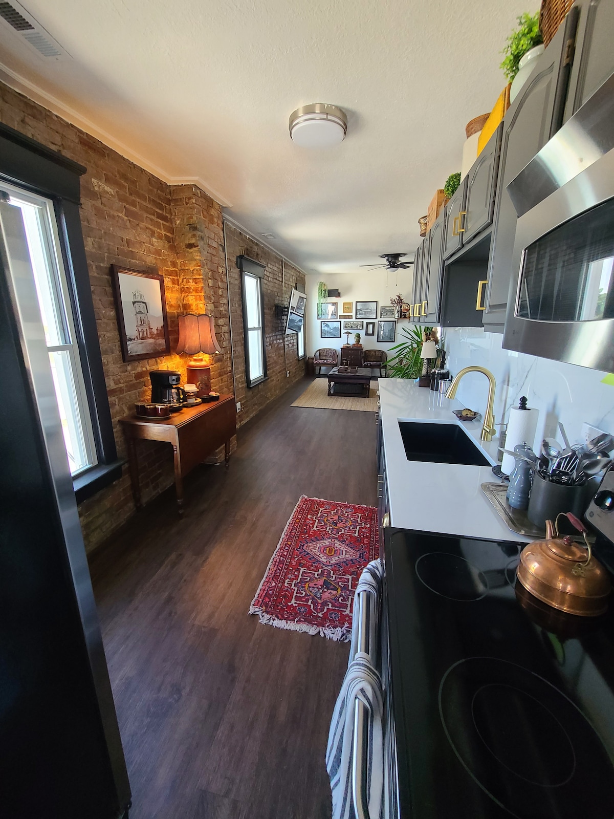 This very unique, large and open 1600 sqft two bedroom suite is situated in a historic 1880s building that is very centrally located & quiet. 15 min. or less away from CPKC & GEHA stadiums, minutes away from Union Station, Rock Island Bridge, the west bottoms & everything fun to do in KC! This suite is full of locally sourced antique furniture and accessories. Large private roof top deck with great views of the Kansas city skyline. enjoy the best part of KC without the noise of being Downtown!